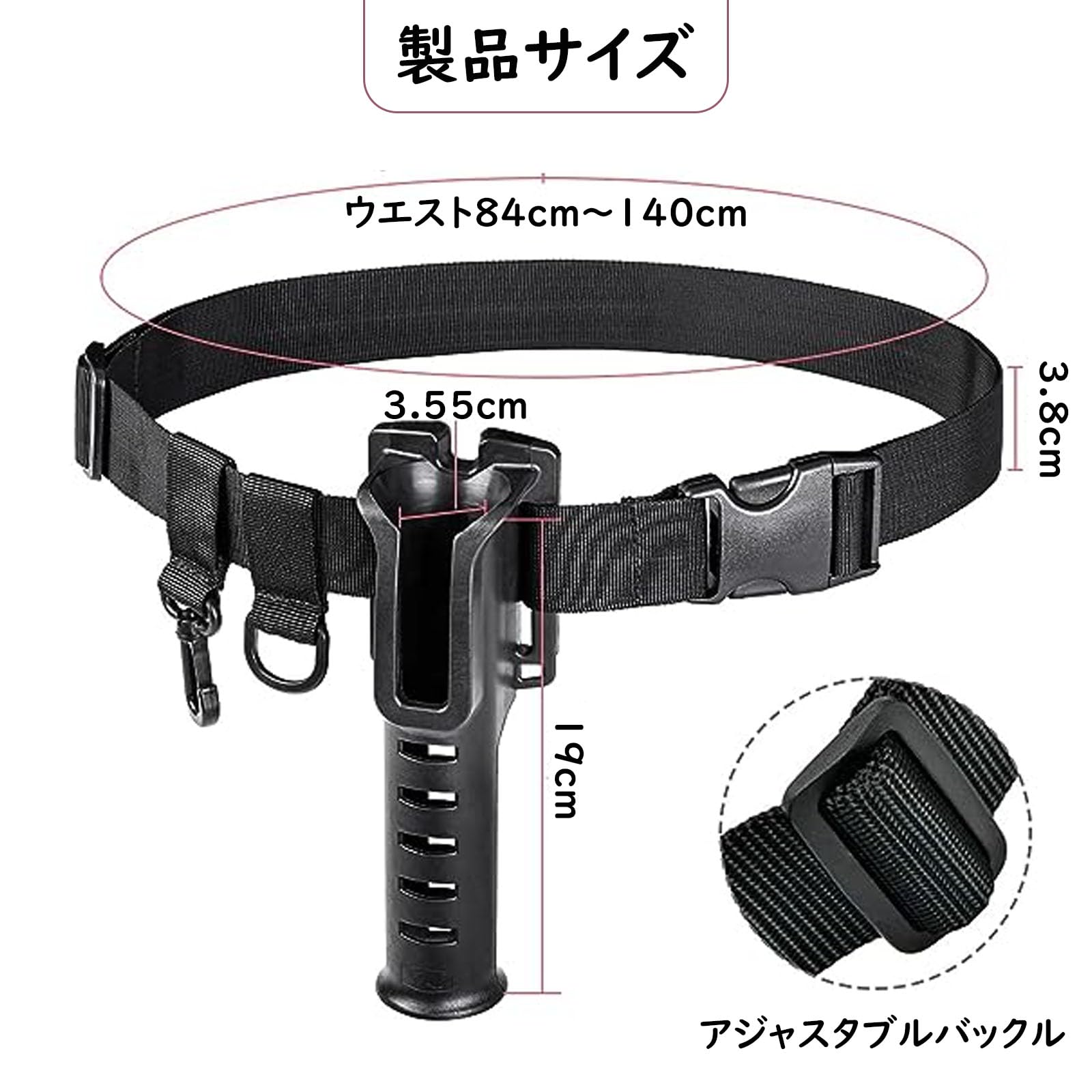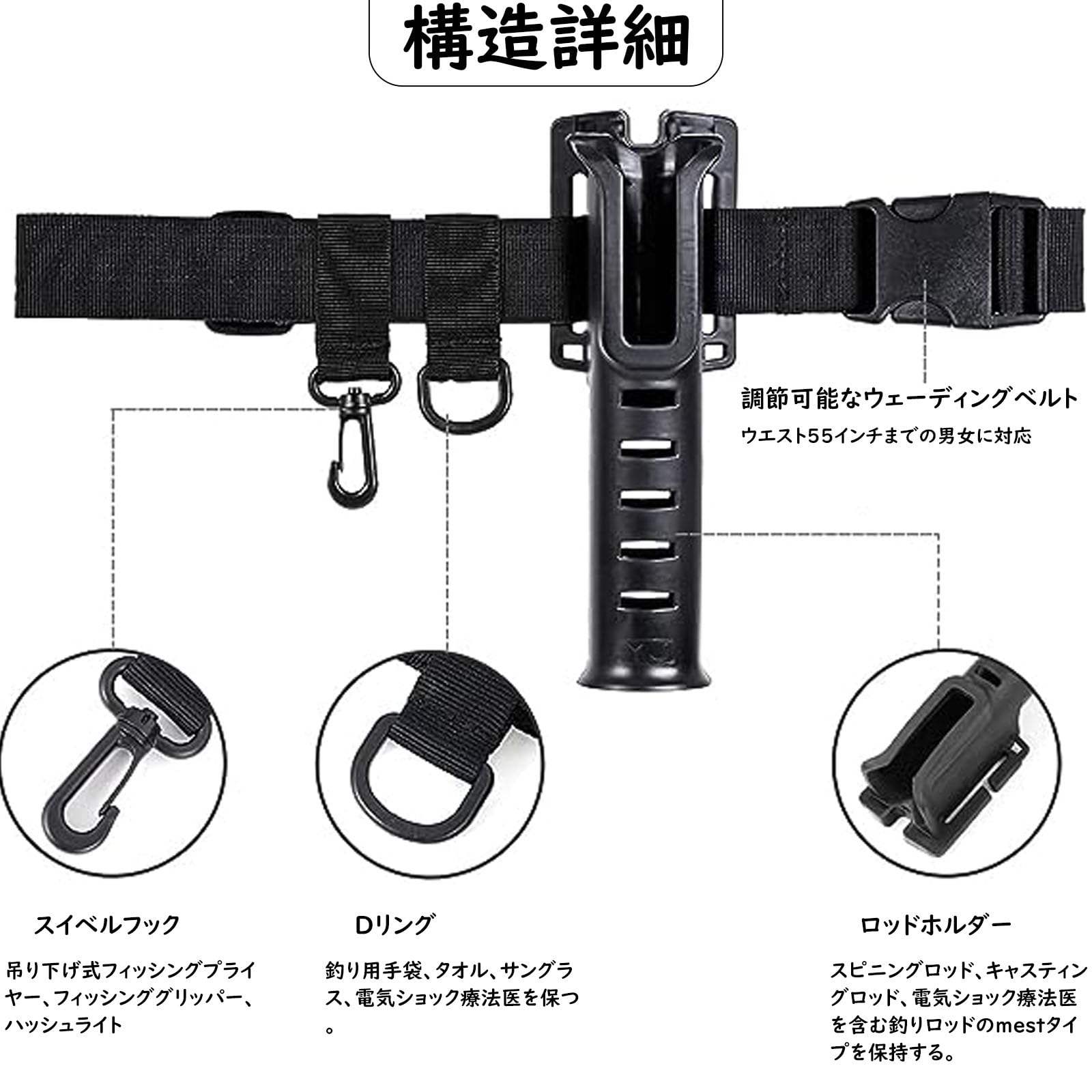 付属品:フィッシングベルトには、Dリング2個、スイベルフック1個、ヘビーフック1個、取り外し可能なロッドホルダーが付属。