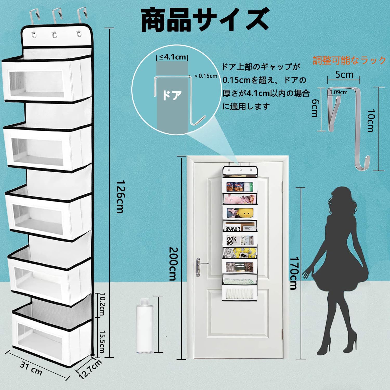 ??【5段の大容量と透明窓付きの設計】-- 五段のウォールポケットで、普通の製品より一つのポケットが多く、化粧品、ぬいぐるみ、タオルなど多くの雑貨を収納できます。透明窓付きの設計なので、収納されているものを見えやすく、財布やカバン、スカーフ、ヘアアクセサリー、おもちゃ、雑誌 などの出し入れも便利です。サイズ(折りたたみ):32×27×7cm。サイズ(展開):126×31×12.7cm。