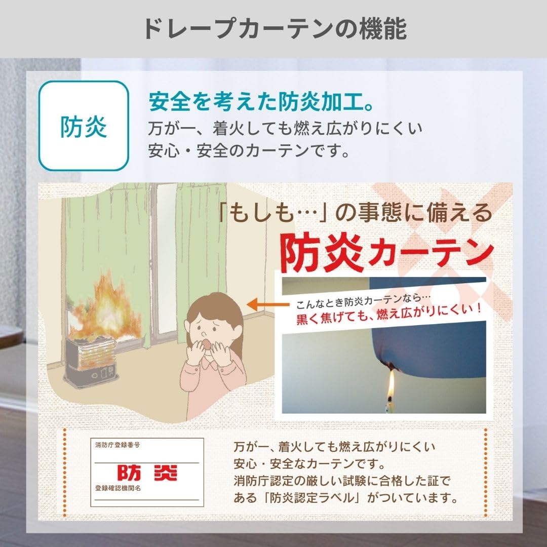 【防炎】万が一着火しても燃え広がりにくい性質を持つ安心・安全のカーテンです。消防法により防炎カーテンの使用が定められている、高層マンションや店舗・福祉・教育施設等はもちろん、防災の観点から一般住宅にもおすすめです。
