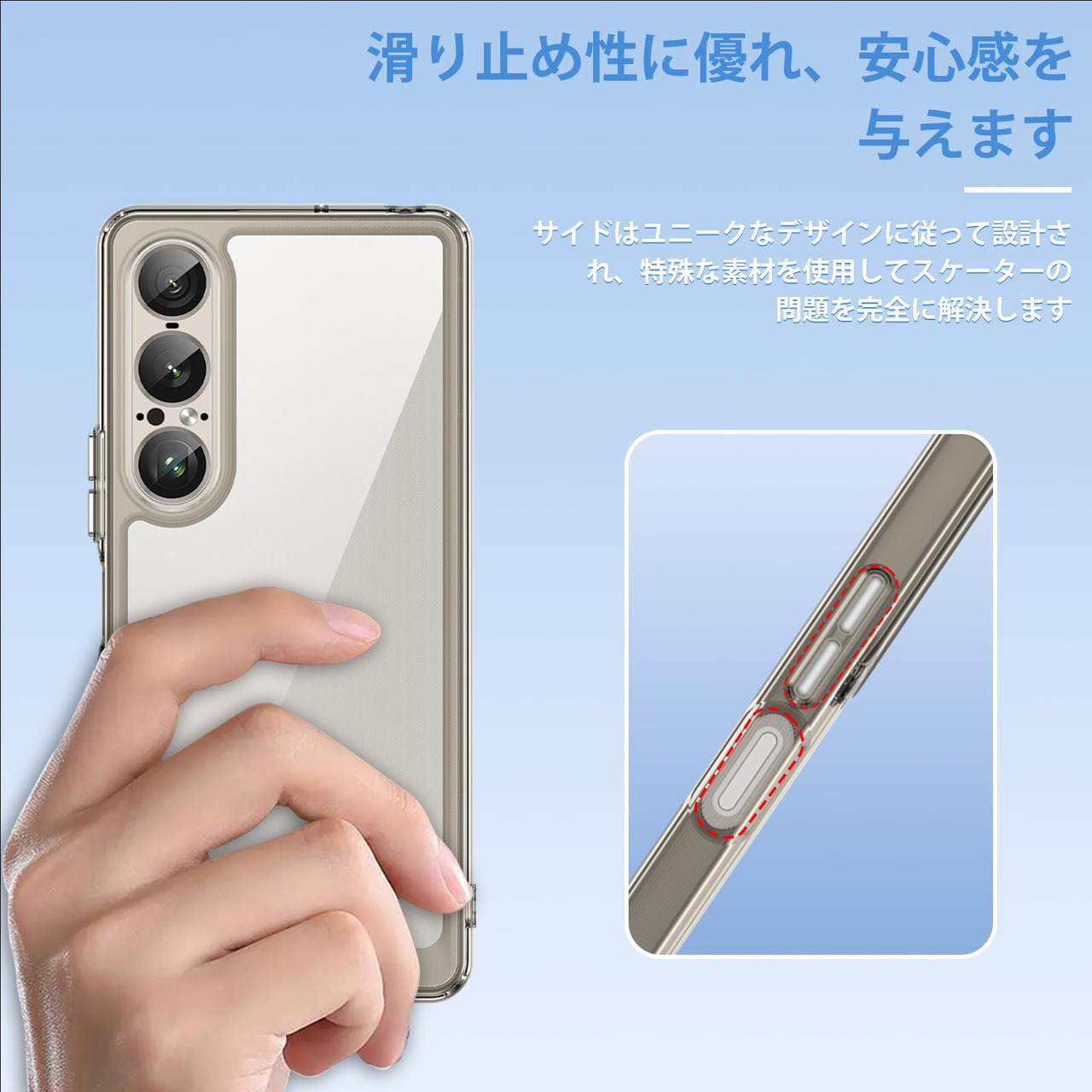[高品質TPU+PC素材] 保護ケースのフレームはTPU素材で作られており、保護ケースの背面パネルはPC素材で作られています。耐久性に優れ、外側部分がある程度の衝撃を吸収し、側面の滑り止め設計でを防ぎます。スマホケース特殊加工を施し、より透明度が高く、指紋が付きにくく黄ばみを防ぎます。適度な柔らかさと弾力があり、手に馴染みやすく滑りにくいです。硬すぎず柔らかすぎない素材なので装着しやすくしっかりと固定できます。