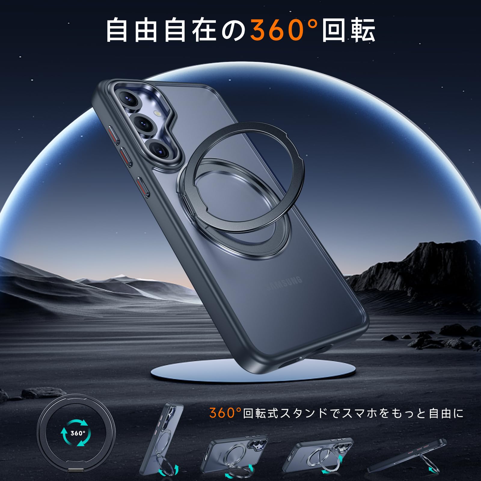 【米軍MIL規格・Magsafe対応】Galaxy S25 用 ケース MagSafe対応 リング 360°回転スタンド機能 縦横両対応 半透明 黄ばみ防止 ワイヤレス充電 レンズ保護 耐衝撃 携帯カバー ギャラクシー S25 カバー マグネット搭載 車載ホルダー マグセーフ対応 おしゃれ (ブラック)