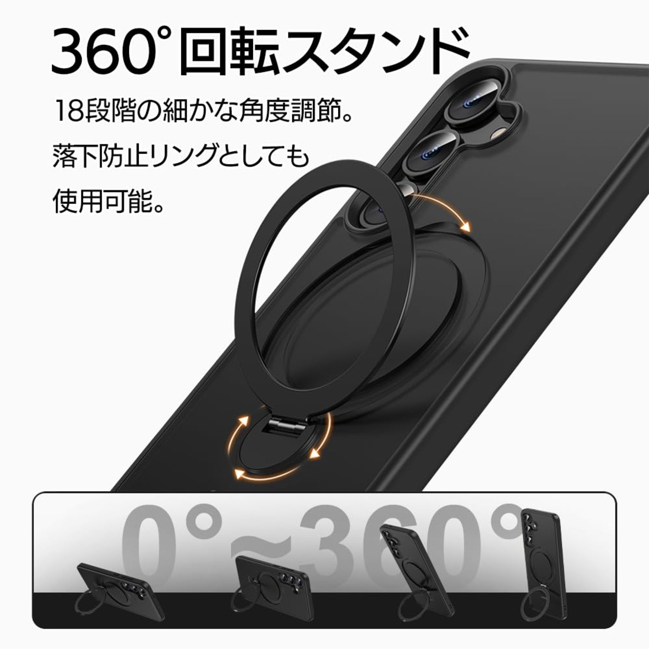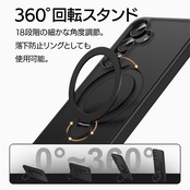 【落下防止リング付き】指が通せて操作安心、落下防止になる「フィンガーリング」付き。120度開閉&360度回転で持ちやすい角度に調整可能です。 開いたリングに立てかけることで横置きの視聴スタンドとしても使用できます。(※背面リングを使用する際は必ず端末とケースを一緒に手に持ってください。 背面リングのみを持って宙づりにしたり、振り回す等の行為はしないでください。端末の落下やケースの破損の原因となります。)