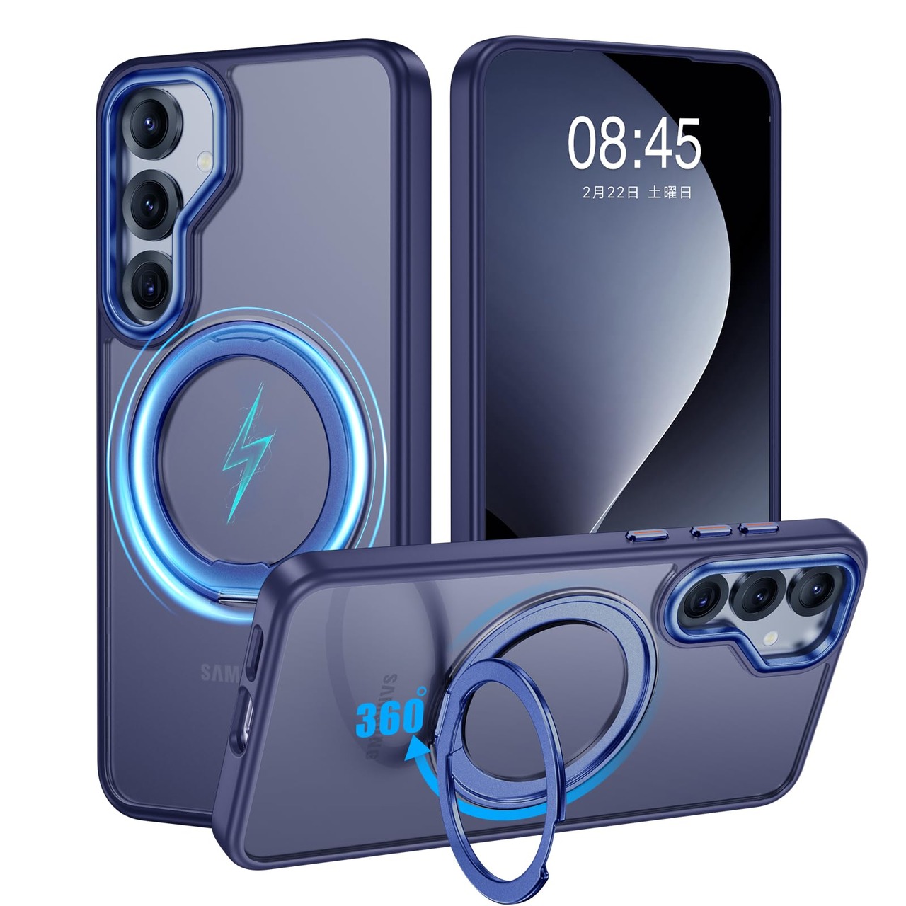 【米軍MIL規格・Magsafe対応】Galaxy S25 用 ケース MagSafe対応 リング 360°回転スタンド機能 縦横両対応 半透明 黄ばみ防止 ワイヤレス充電 レンズ保護 耐衝撃 携帯カバー ギャラクシー S25 カバー マグネット搭載 車載ホルダー マグセーフ対応 おしゃれ (ブルー)