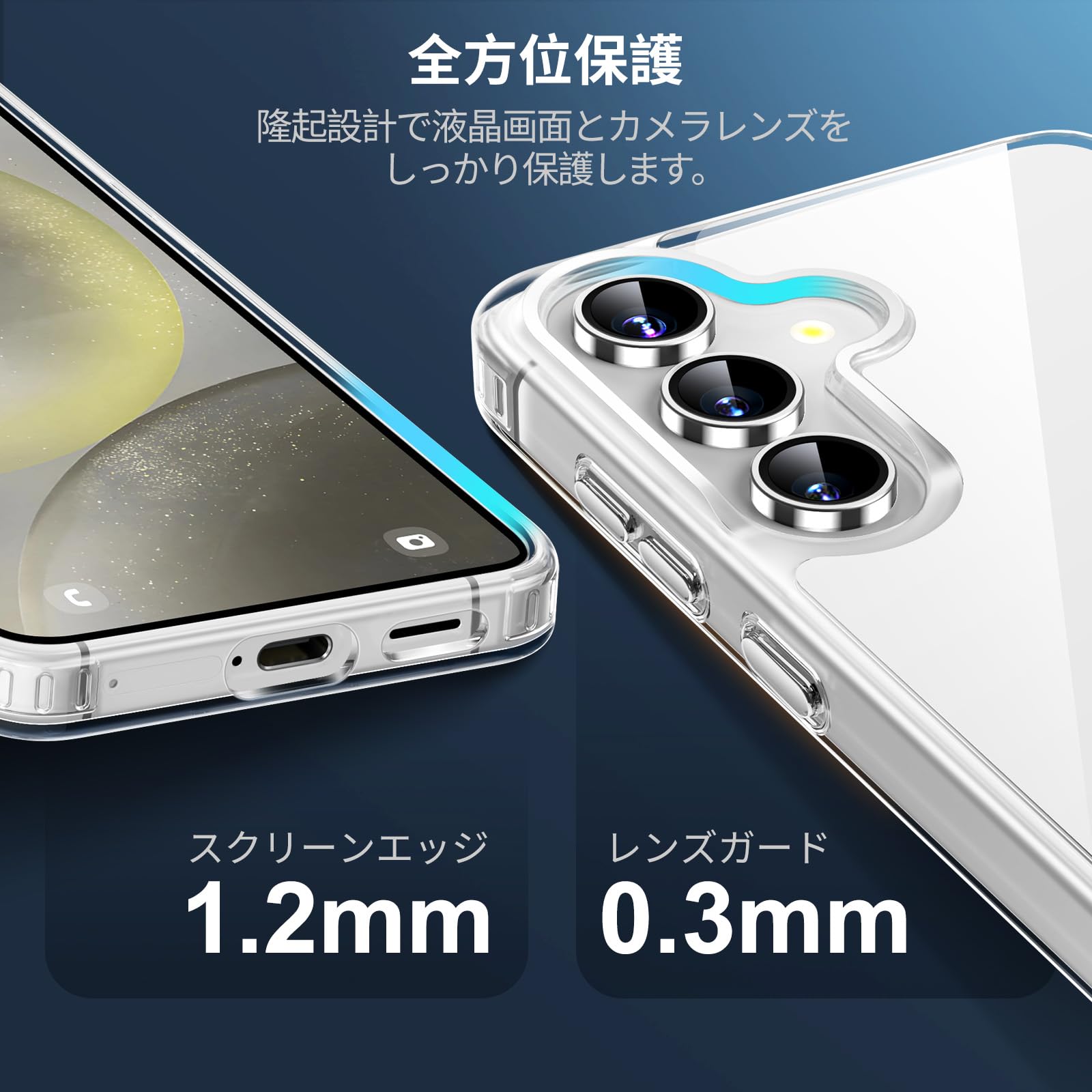 【画面もカメラレンズも安心保護】galaxy s24 ケース 透明 のフチはカメラレンズより0.3mm、液晶画面より1.2mm高く設計されており、平らな場所にスマートフォンを置いても画面やレンズが直接接触する心配はありません。