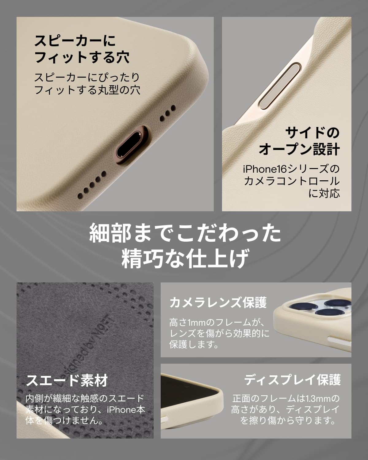 【細部までしっかり保護】iPhone 16 Proに設計されたカメラレンズ保護は、高さ1mmのフレームがあり、レンズを傷から効果的に保護します。 ケースの内側には繊細な触感のスエード素材を採用し、iPhone本体に傷がつくのを防ぎます。正面のフレームは1.3mmの高さがあり、ディスプレイを擦り傷から守ります。iPhone 16 Proのスピーカーにぴったりフィットする丸型の穴によって、外観の美しさをより高めるだけでなく、音質保護も向上させます。