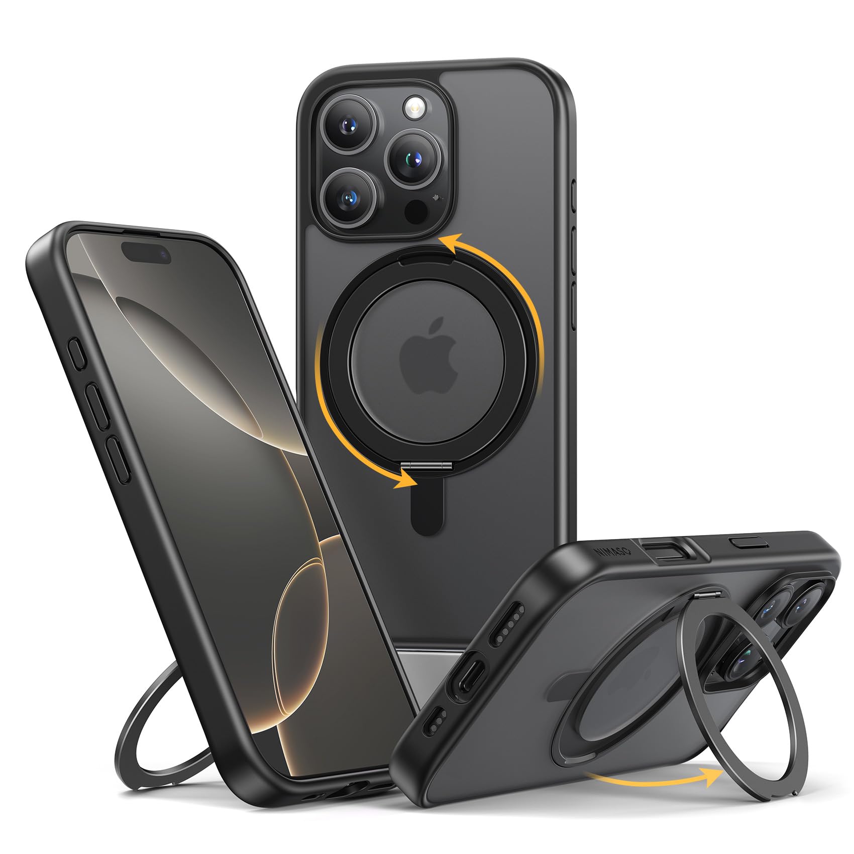 NIMASO iPhone16Pro用 ケース 縦横両対応 360°回転スタンドケース MagSafe対応 携帯スマホケース リングマグネット搭載 カバー いPhone16Pro対応 ワイヤレス充電対応 マット感 防指紋 米軍MIL規格 耐衝撃性 アジャスタブルスタンド アイフォン16プロ対応 (6.3インチ) ブラック (黒羽シリーズ)NSC24G1346