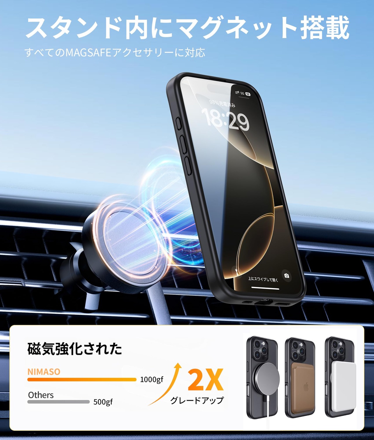 【特価在庫】NIMASO iPhone16Pro用 ケース 縦横両対応 360°回転スタンドケース MagSafe対応 携帯スマホケース リングマグネット搭載 カバー いPhone16Pro対応 ワイヤレス充電対応 マット感 防指紋 米軍MIL規格 耐衝撃性 アジャスタブルスタンド アイフォン16プロ対応 (6.3インチ) ブラック (黒羽シリーズ)NSC24G1346 | GIGATERA