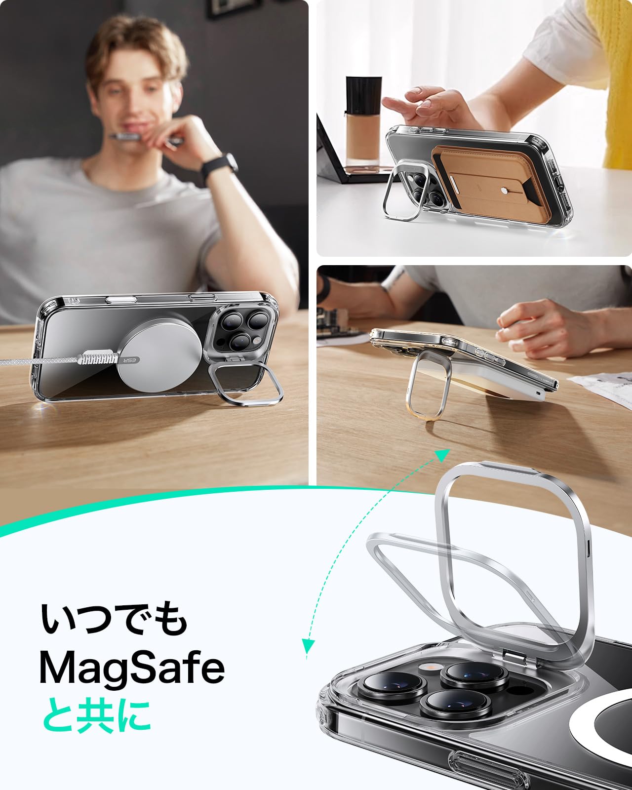 【調節可能な隠れスタンド】折りたたんだときにカメラのフレームに隠れるように配置され、MagSafeリングを100%妨げず、いつでもどこでも自由に調整でき、安定した角度で動画を視聴できます。対応機種:iphone16pro ケース