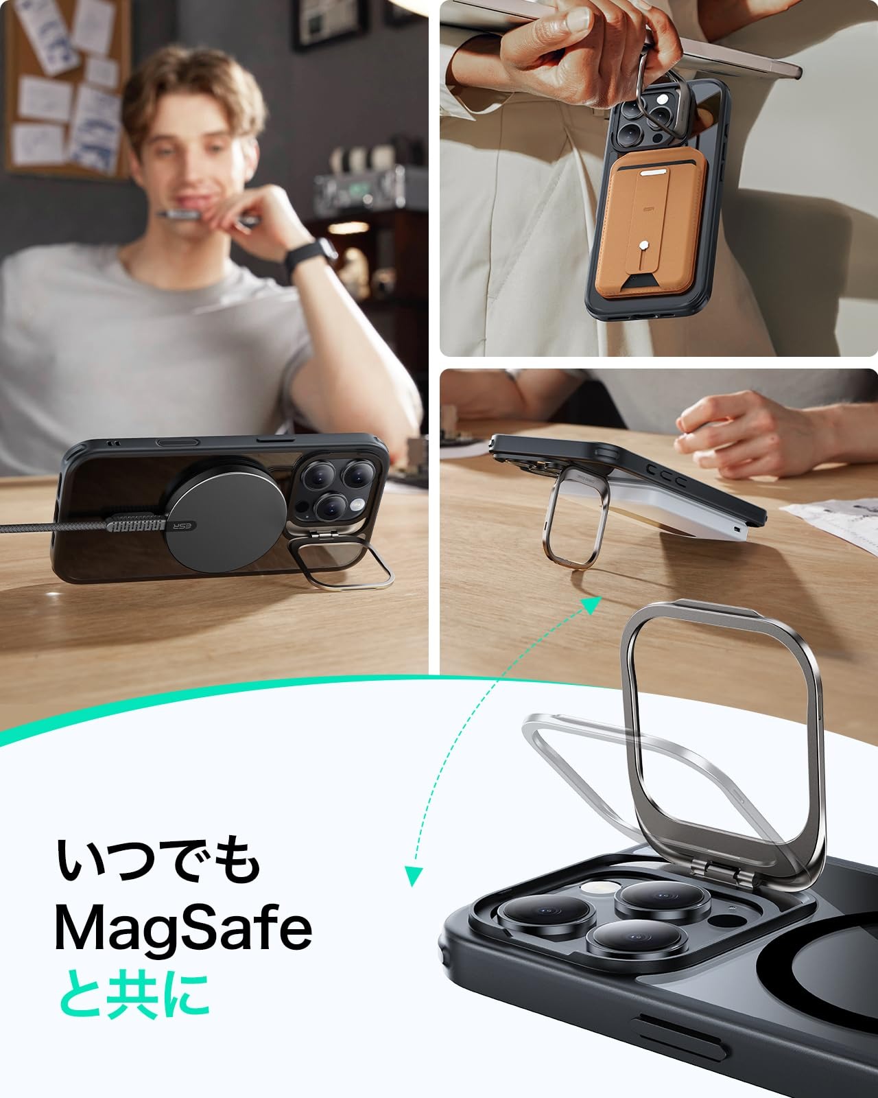【調節可能な隠れスタンド】折りたたんだときにカメラのフレームに隠れるように配置され、MagSafeリングを100%妨げず、いつでもどこでも自由に調整でき、安定した角度で動画を視聴できます。対応機種:iphone16pro ケース