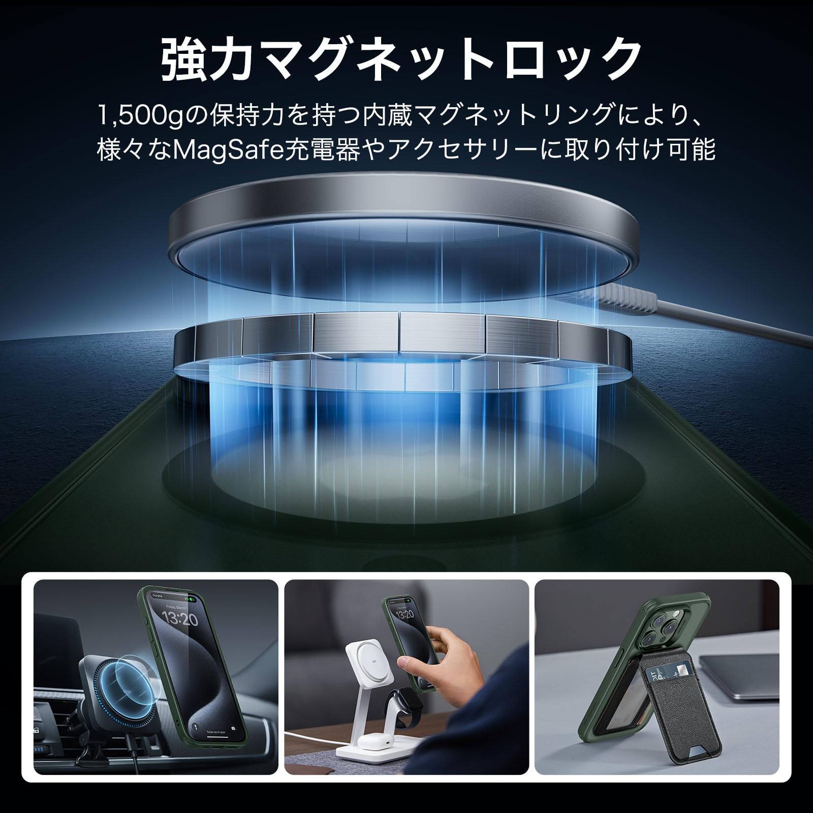 【強力吸着・MagSafe対応】ESR いphone15promax ケースは1,500 gの吸着力を持つ強力な内蔵磁石により、それにより、多種なマグネットアクセサリーとの素晴らしい組み合わせを実現でき、ガッチリ吸着する事でスマホケースを装着したiphone 15 pro maxを急速にワイヤレス充電できます