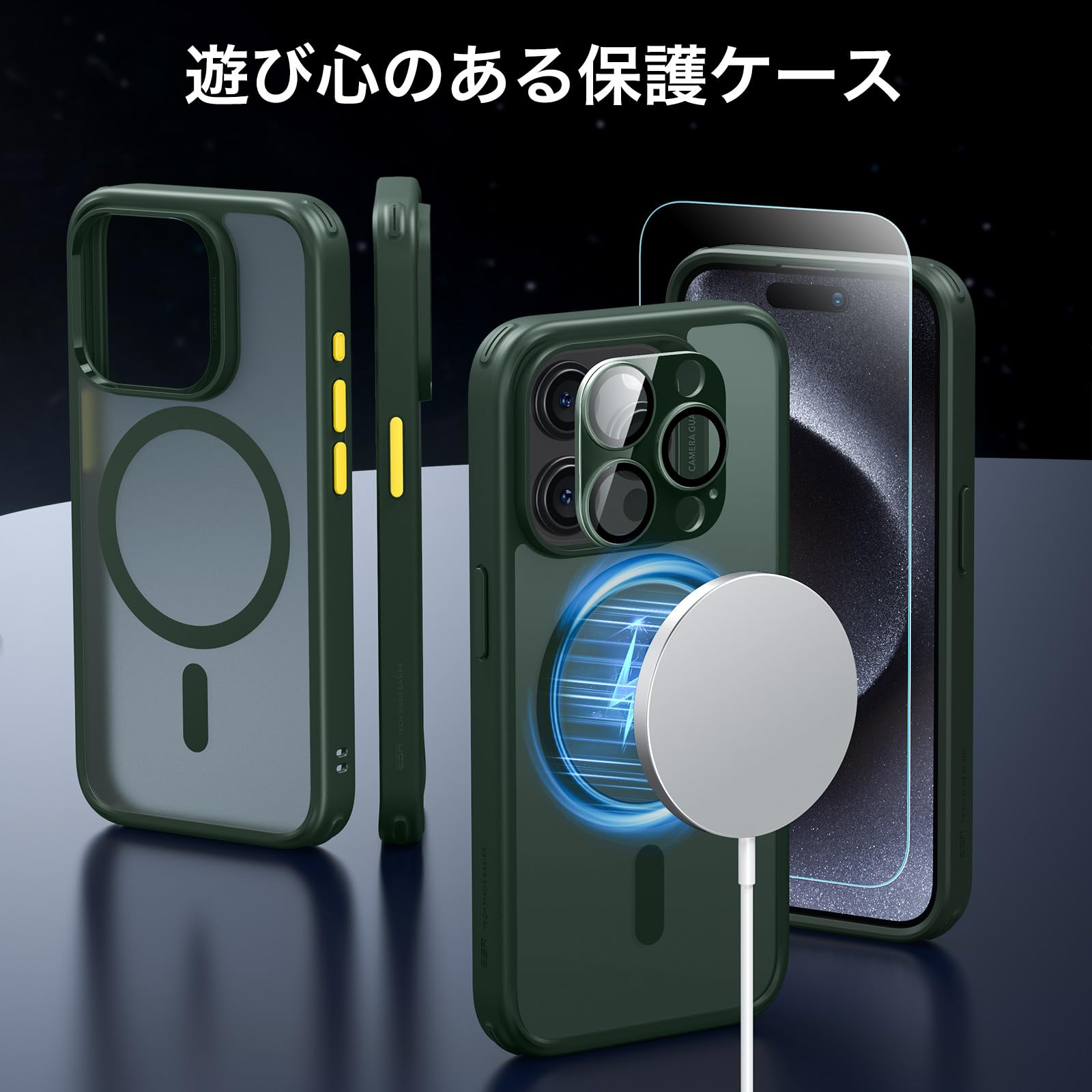 【4 in 1セット!保護フィルム付き】ESR iPhone 15 Pro Max ケース Magsafe対応 半透明 マットケース 画面 保護フィルム付き 米軍MIL規格 耐衝撃 傷防止 いphone15pro max ケース ストラップホール付き Classicシリーズ(クリア_フロストグリーン)