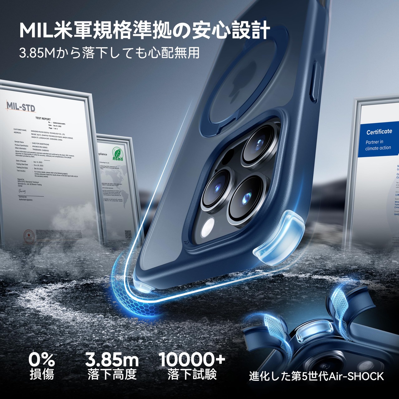 【MIL米軍規格取得・驚異の防御!】業界高レベルの硬度と耐衝撃度を実現。3.85Mから落下させてもスマホ本体は綺麗に無傷!過酷な米国国防総省の耐衝撃試験「MIL-STD-810G」認証クリアし、特別な振動低減技術と三重耐衝撃構造、ケースの四隅に進化された第5世代AIR‐SHOCHを搭載することにより、衝撃吸収性能を20倍アップ!どのような角度の衝撃に対しても受け止めて大切なスマホをしっかりと保護!また、側面にだけの滑り止め設計により、ホールド感が高まり、春から夏にかけて手汗が濡らしても滑りにくい。米軍MIL認証番号:GZMR240702237705|認証機関:CSTC Standards Testing Center | 認証時間:Jul 20, 2024