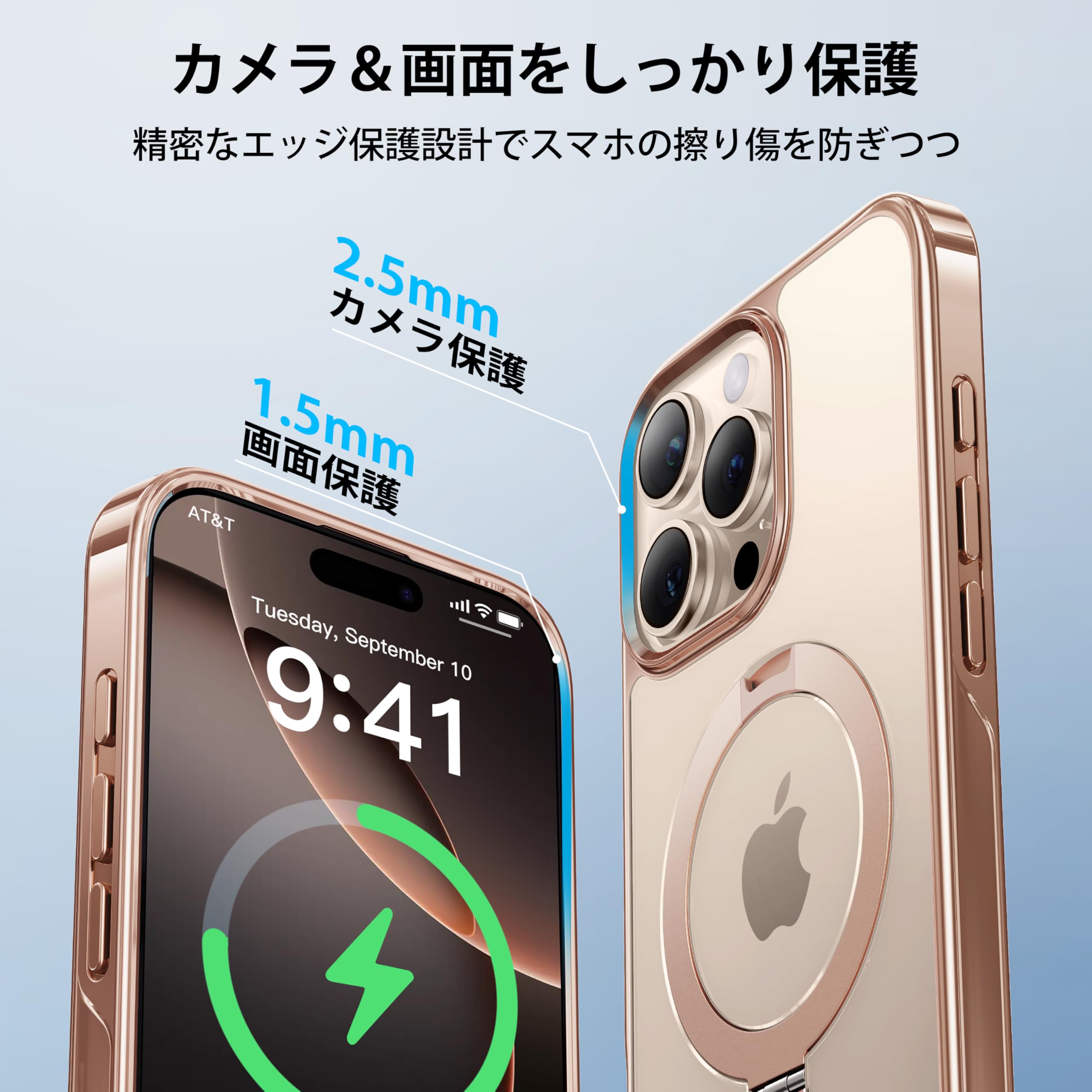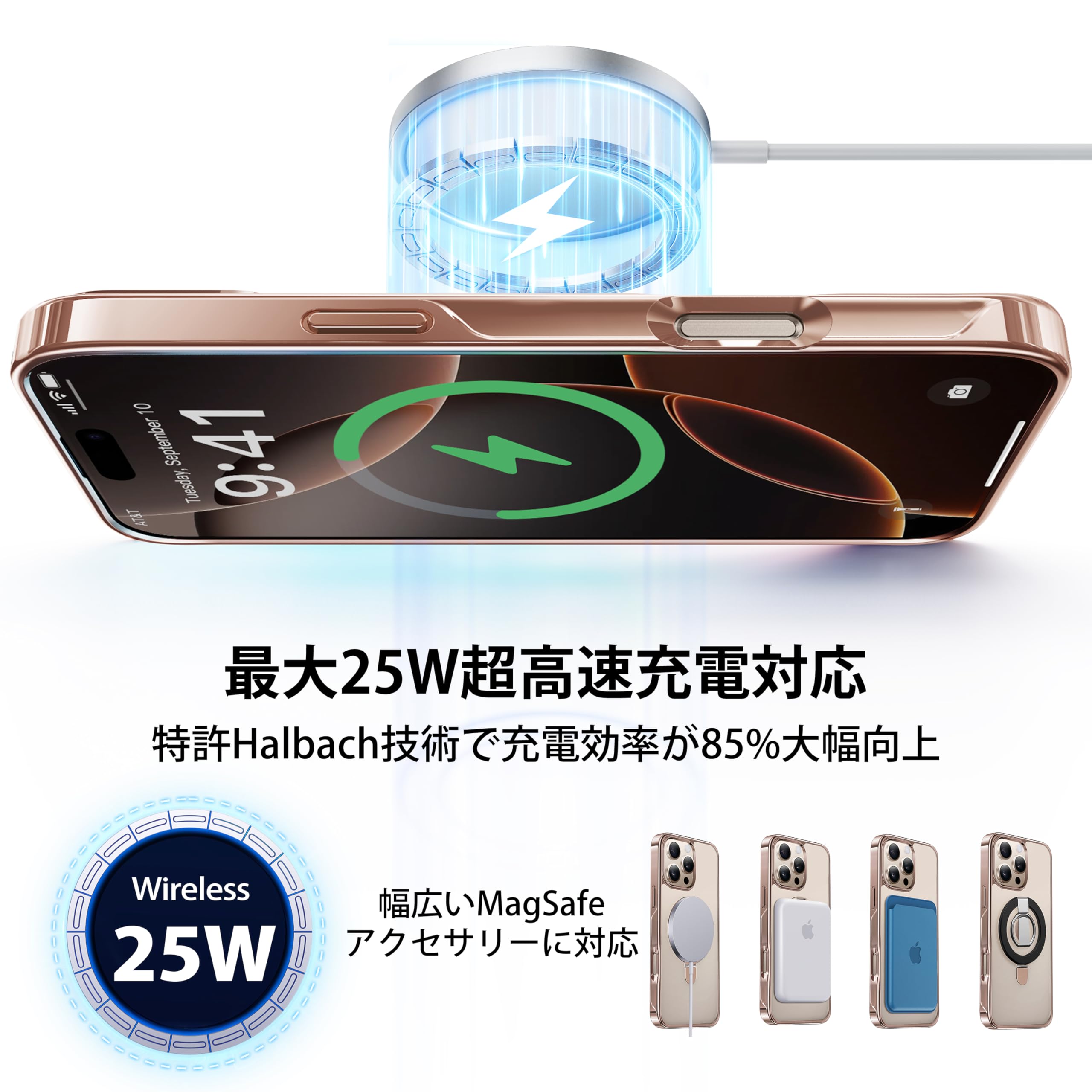 【超強磁力&最大25W高速充電対応】市販のケースではワイヤレス充電ができなくなることがありますが、当社独自のHalbach配列磁界閉鎖技術により、スマホ本体への影響を抑えつつ、ワイヤレス充電機能を妨げません。さらに、最大25Wの高速ワイヤレス充電に対応し、スムーズな充電を実現します。また、業界最強のN56磁石を採用し、従来品と比べ吸着力が20倍に向上。MagSafe対応の車載ホルダーに装着したまま、悪路でもしっかり固定され、落下の心配なく快適に使用できます。さらに、両面式マグネットを搭載しており、冷蔵庫や壁、キッチンなど鉄製の場所に貼り付けたまま動画視聴も可能。スマホの使い方がさらに広がります。対応機種:いphone16pro ケース
