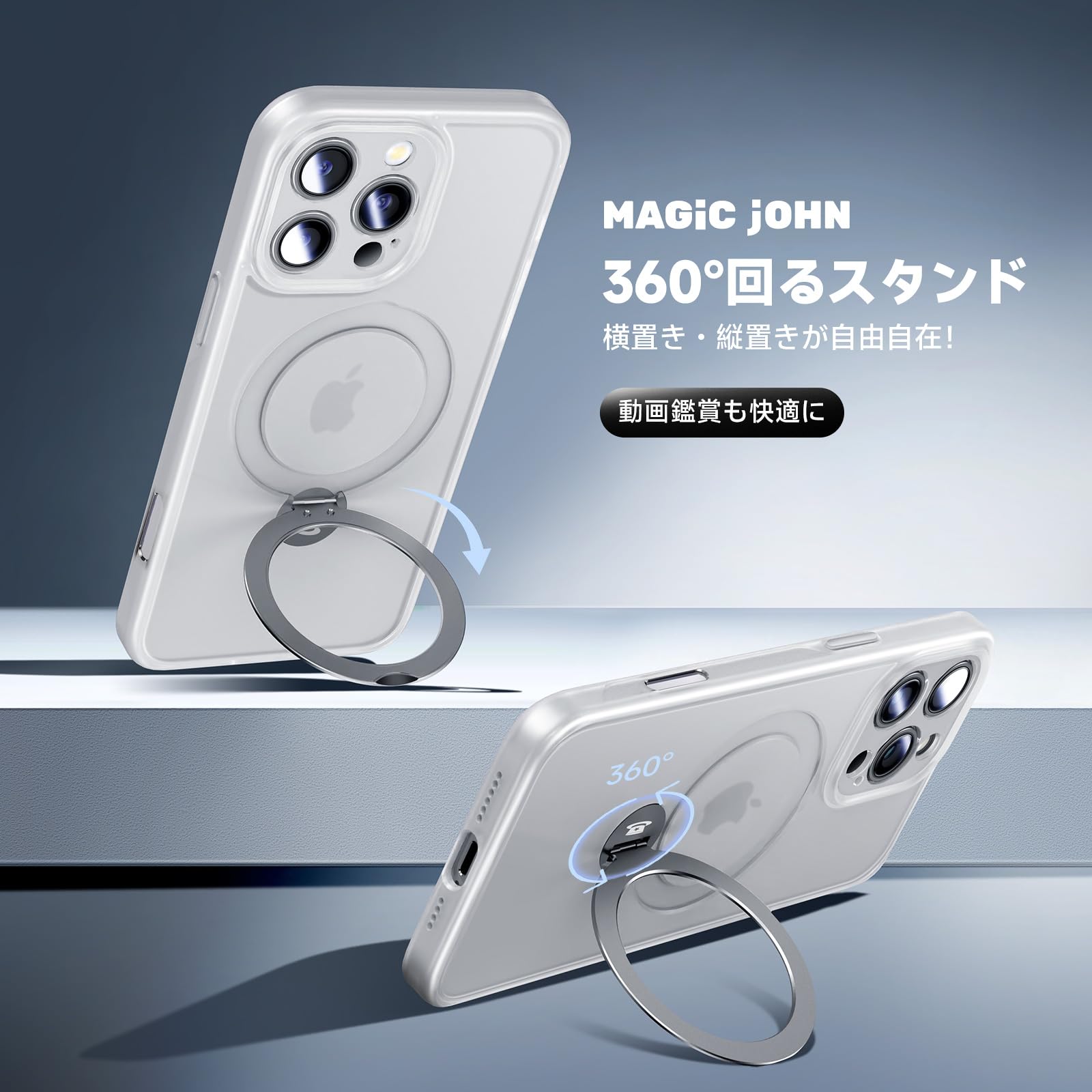Magic John iPhone 16 Pro 用 ケース 耐衝撃 MagSafe対応 ワイヤレス充電 スタンド付き 360°回転 滑り止め いphone16 Pro 用 ケース 半透明 カメラ保護 TPU ズレにくい ホコリ付きにくい スマホケース iphone 16 Pro 用 ホワイト