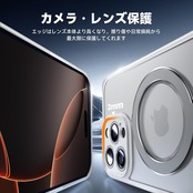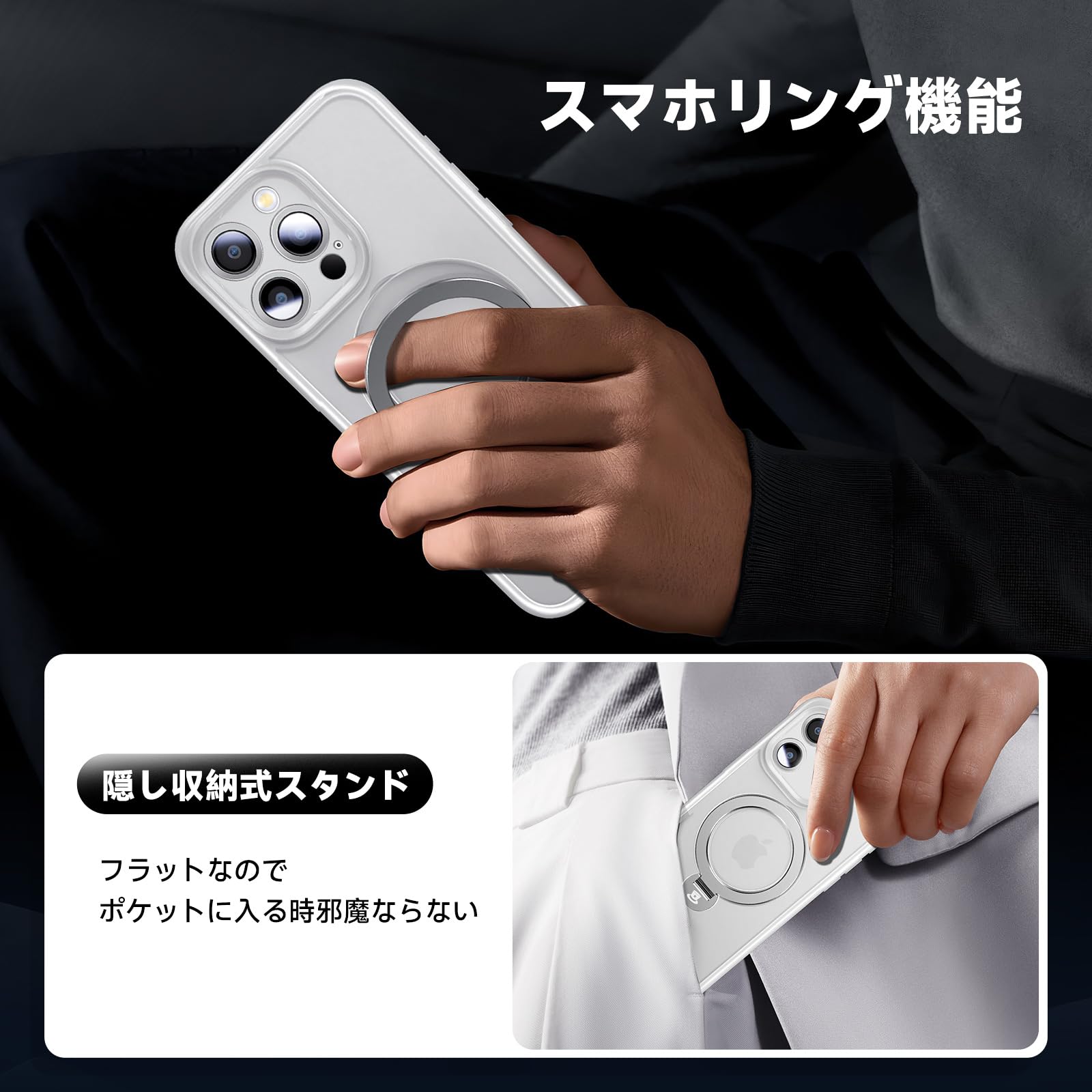 特徴 360°回転回るスタンド、隠し収納、滑り止めデザイン(持つとこ)、MagSafe対応、ワイヤレス充電、カメラレンズ保護