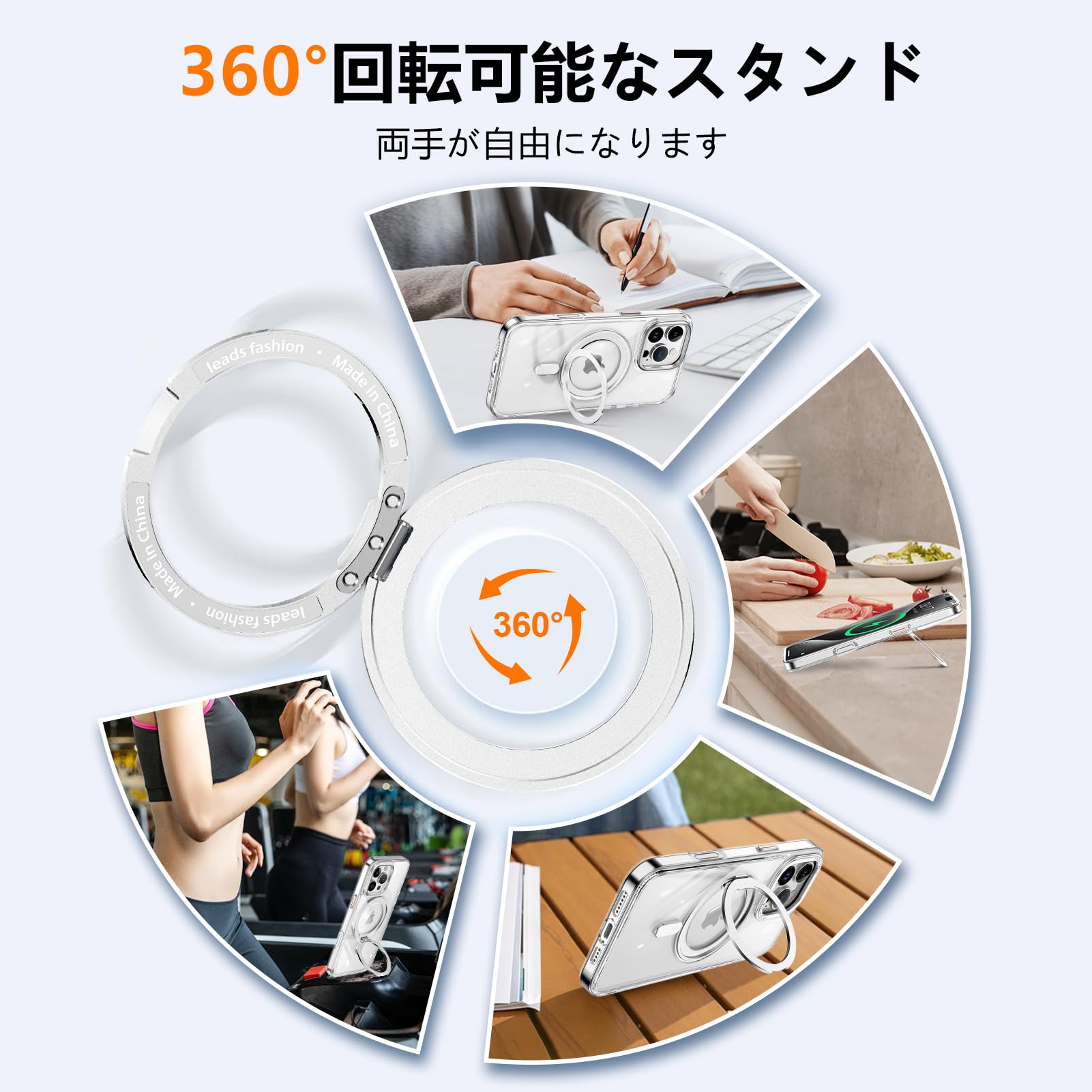 【360度!隠し多機能スタンド】多機能スタンドがあれば、映画鑑賞時にはデバイスを横向きにして快適に楽しむことができ、縦向きにすればオンライン学習や仕事を効率的に進めることができます。角度調整は40°から120°まで自在に行え、外出先でも気軽に使えるため、リラックスした時間を過ごせます。**スタンドがを過度に引っ張らないでください。スタンドが外れる原因となる場合があります。**また、リングやスタンドを別途持ち歩く必要がなく、隠しスタンドの設計により、省スペース性にも優れています。収納時には水平に置くことができ、持ち運びの際にも邪魔になりません。**ご注意ください:スタンドを過度に引っ張ったり強い力を加えたりしないでください。変形や脱落の原因となる恐れがあります。