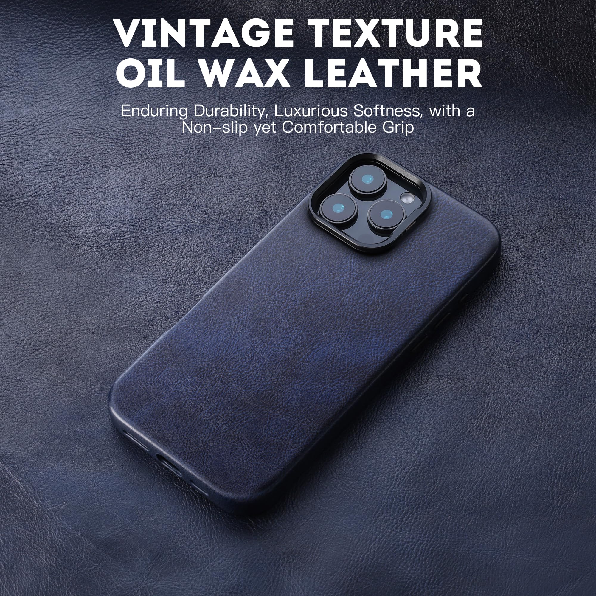Kingflag iPhone 16 Pro Max用 本革レザーケース 調整可能な隠しスタンド MagSafe対応 ヴィンテージ風の質感オイルワックス加工牛革 レンズ保護 メタルボタンとカメラベゼル ネイビーブルー