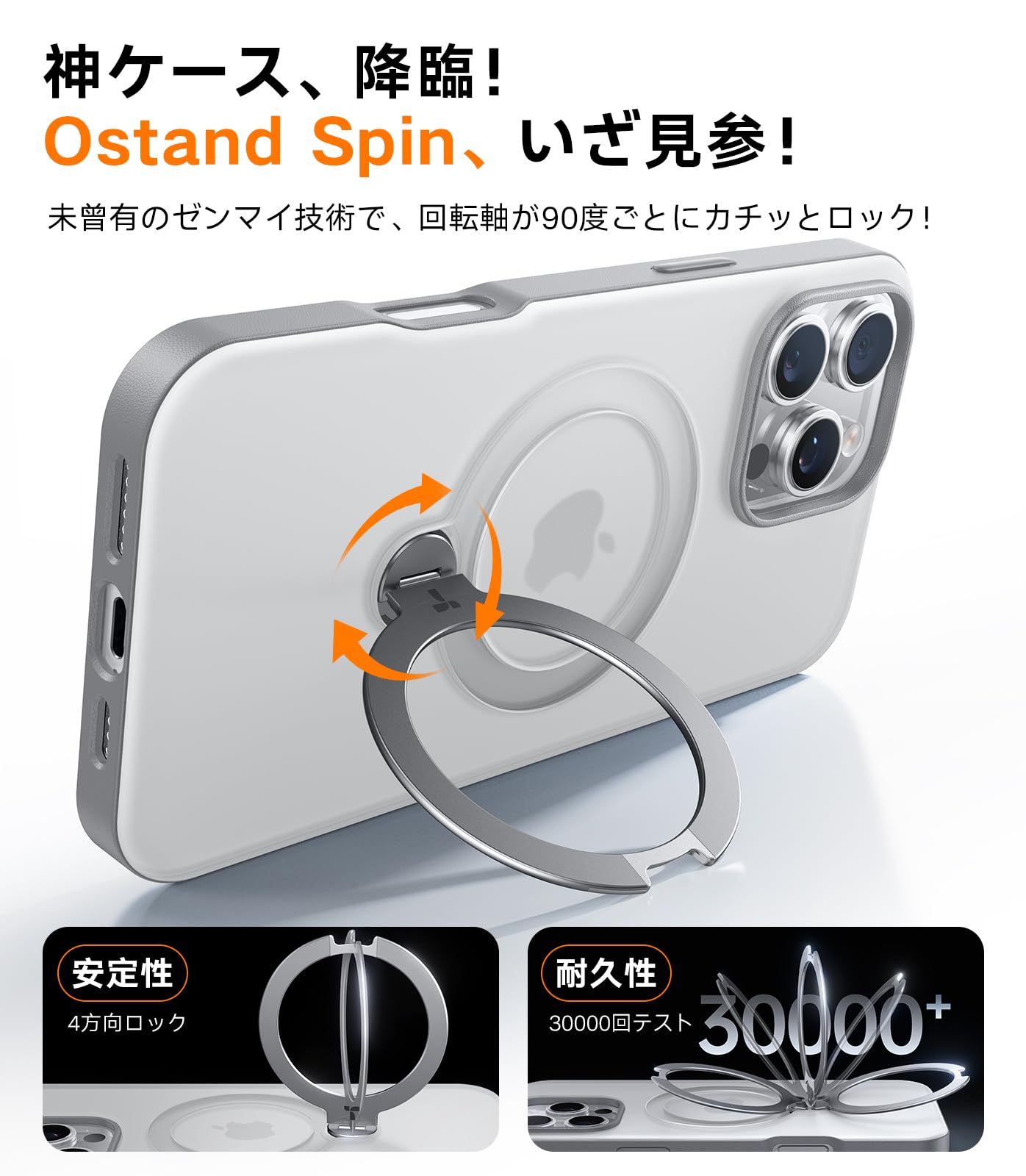 【軍用保護・ご愛機を守る聖盾!】「修理代が高すぎて、困ったな…どうしよう?」Ostand Spinで、源から解決しよう!2024年の最新ショック吸収材料と構造を採用し、どんな過酷な状況にも耐えうる強度を備えている。米軍規格の厳格な認証も取得済み(認証番号:GZMR220300651)。高価ないphone16promax 用 スマホを隅々まで完璧に保護。【※ケースの表面には黄ばみや汚れに対するコーティングが施されているため、少し滑りやすいですが、さっぱりとした手触りを保つことができます。ご理解いただければ幸いです。】
