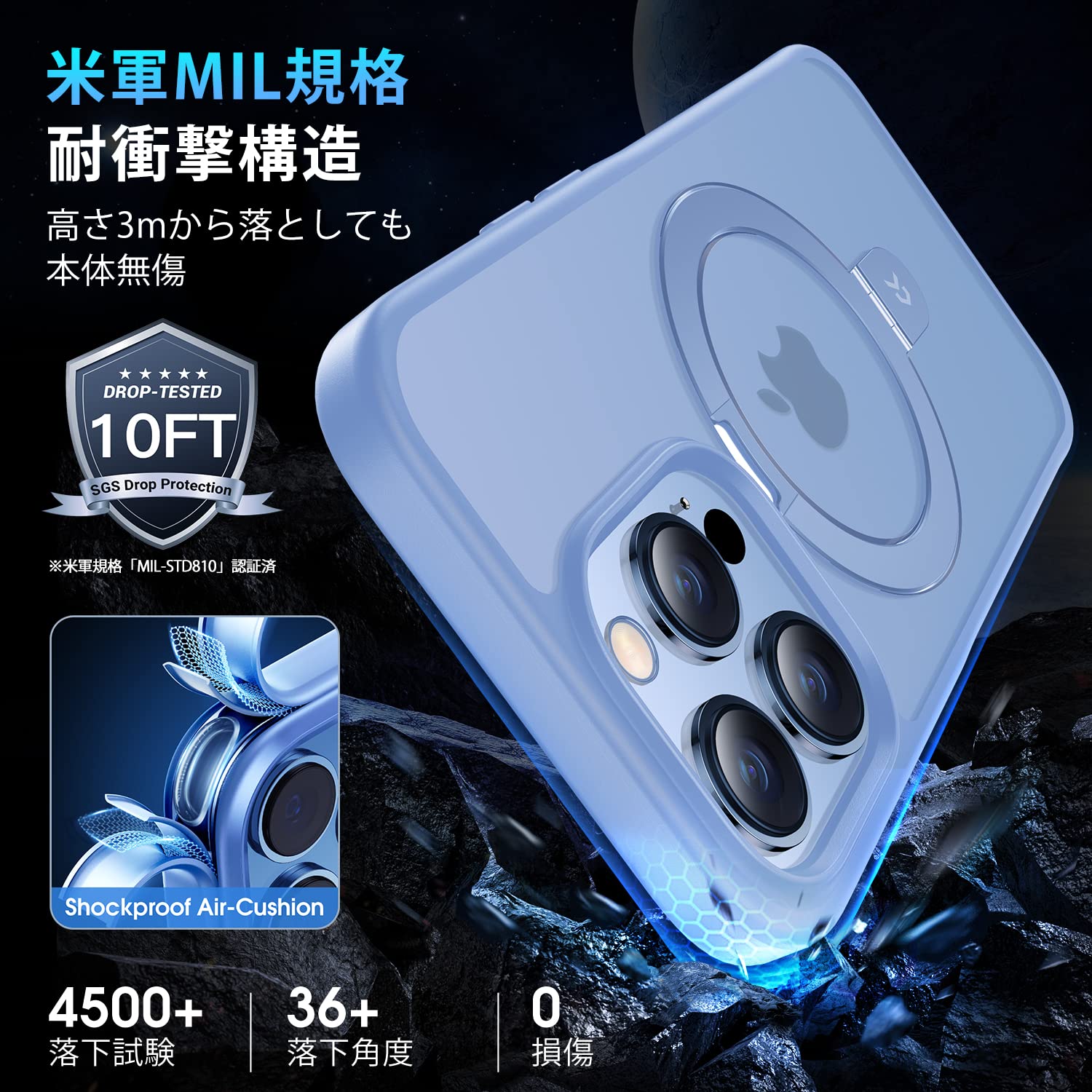 ??【米軍MIL規格・360°落下保護】高さ3.05M、36方向の角度から、4500回以上、落下させられても尚無傷、鍛えに鍛え上げたタフさ。防弾シールドに使用され、高硬度・高耐傷性に誇りポリカーボネート素材使用。更に三重耐衝撃構造とU-Shockエアクッションは、どの角度からの衝撃に対しても受け止めて吸収します。液晶画面より1.5mm、カメラレンズより2.5mm高め、スマホを全面的に保護します。