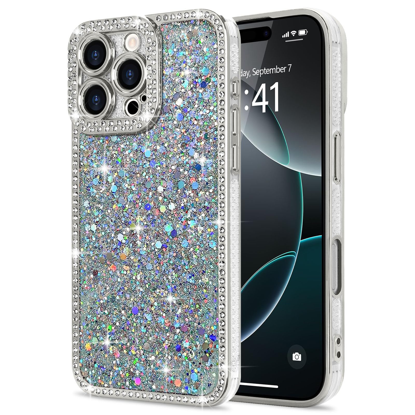Lafunda iPhone 16 Pro Max 用 ケース キラキラ ラメ ダイヤモンドストーン デコ 女の子 豪華 人気 衝撃吸収 TPU 軽量 落下防止 おしゃれ ワイヤレス充電対応 アイホン16 Pro Max 用携帯ケース 6.9インチ対応 シルバー