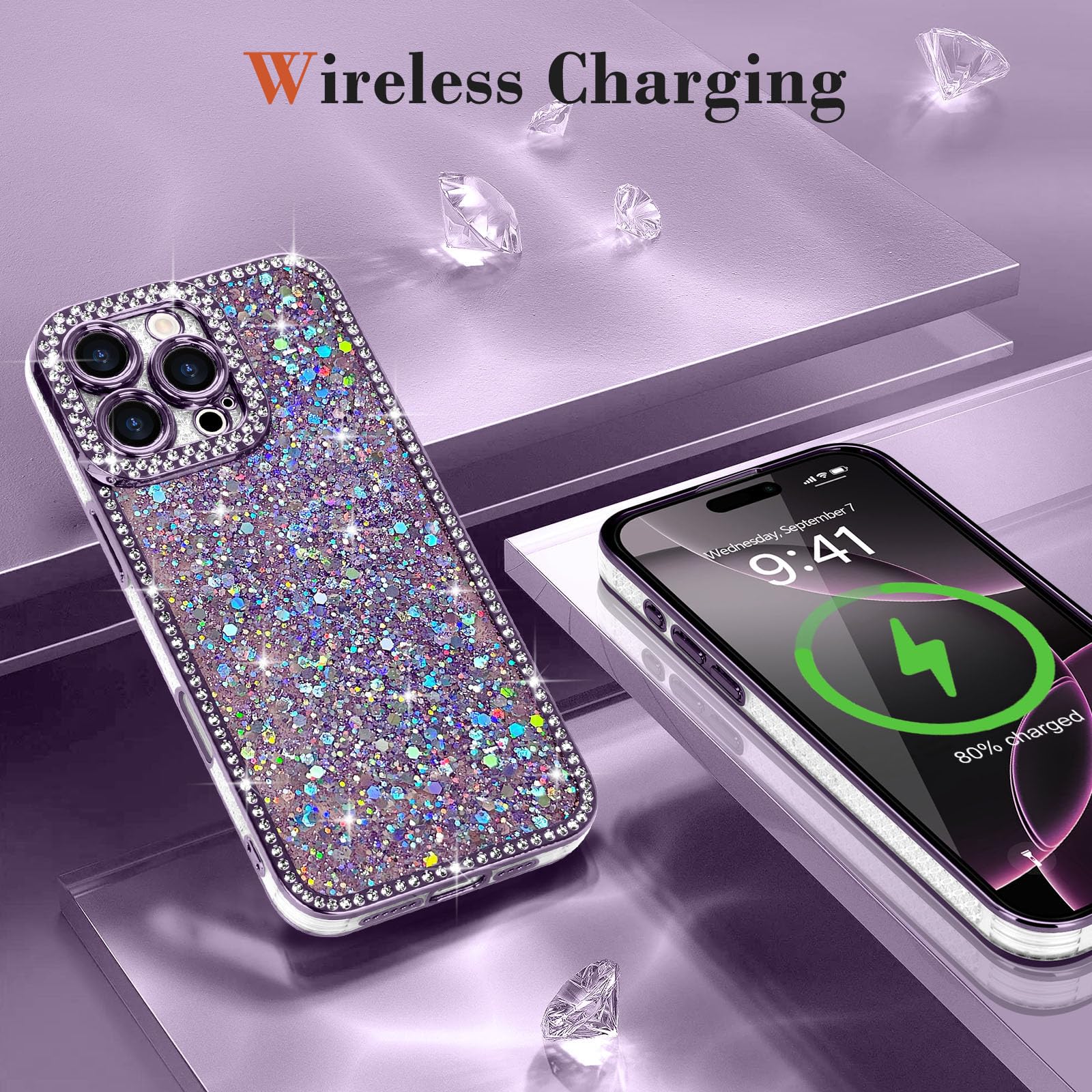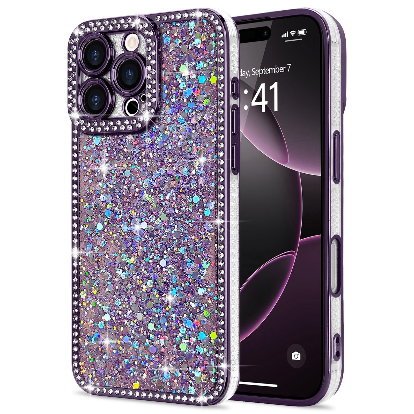 Lafunda iPhone 16 Pro Max 用 ケース キラキラ ラメ ダイヤモンドストーン デコ 女の子 豪華 人気 衝撃吸収 TPU 軽量 落下防止 おしゃれ ワイヤレス充電対応 アイホン16 Pro Max 用携帯ケース 6.9インチ対応 パープル
