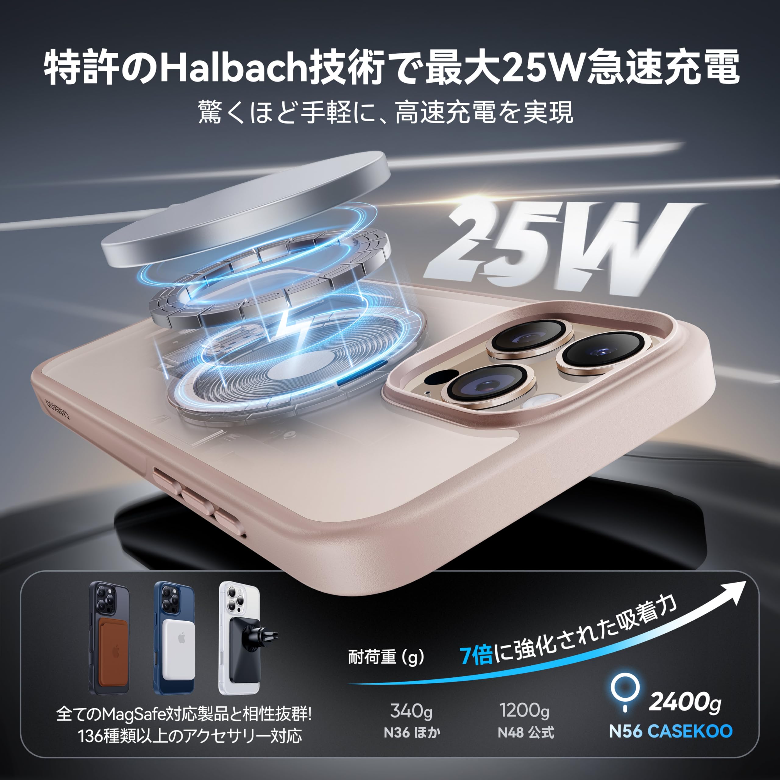 【世間を席巻したパワー・最大25W急速充電】内部に組み込まれた360度全周型のHalbach磁石配列により、業界屈指の強力な磁力を実現!これを通じて、スマホを確実に固定しながら、最大25Wの超高速ワイヤレス充電を提供します。車載ホルダーや鉄面に取り付けることで、どんな状況でも安定して使用でき。悪路での運転中や振動が激しい場面でも、スマホがずれる心配はありません。キッチンや浴室、外出時でも壁に取り付けてハンズフリーで動画視聴が楽しめます。N56マグネット磁石の圧倒的な吸着力で、どんな環境でも安心して利用できる万能なケースです。対応機種:iPhone16 pro ケース