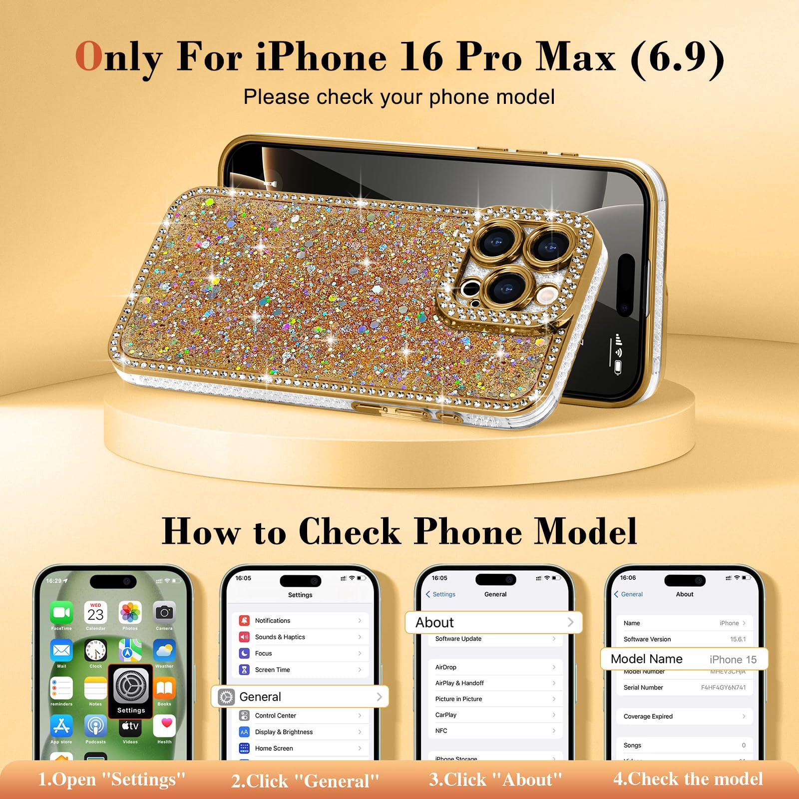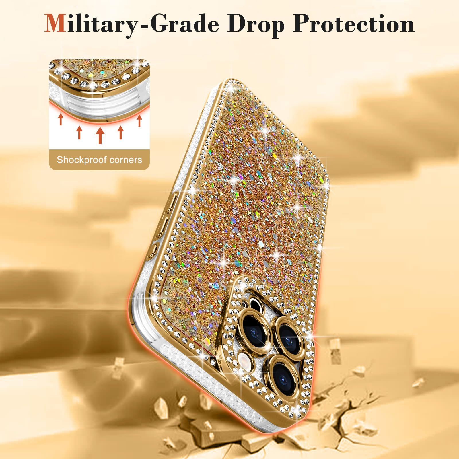 Lafunda iPhone 16 Pro Max 用 ケース キラキラ ラメ ダイヤモンドストーン デコ 女の子 豪華 人気 衝撃吸収 TPU 軽量 落下防止 おしゃれ ワイヤレス充電対応 アイホン16 Pro Max 用携帯ケース 6.9インチ対応 ゴールド
