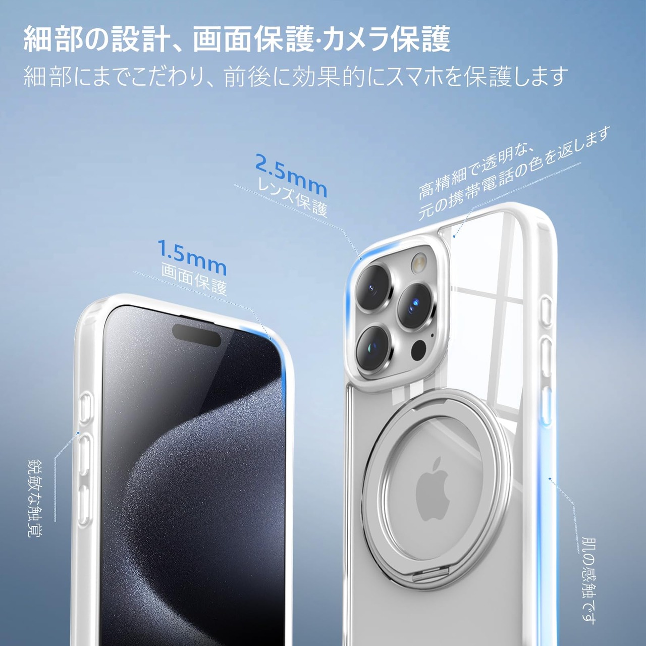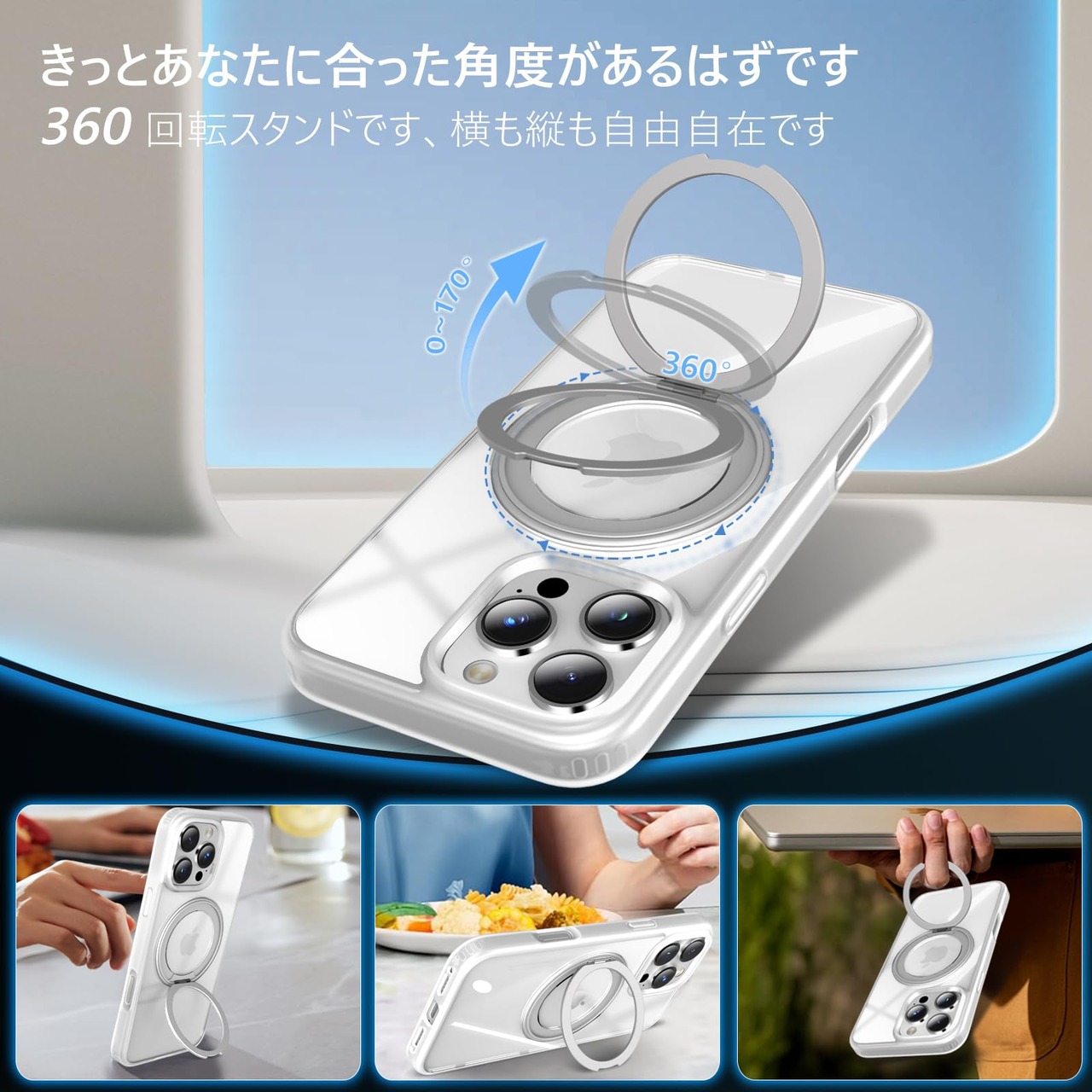 【360度回転スタンド・縦横両対応】KATSUTOYO iPhone 15 pro 用 ケース magsafe 黄ばみにくい 強磁力リング マグネット搭載 360°回転スタンド 縦横両対応 MagSafe対応 高耐久性 米軍MIL規格 耐衝撃 指紋防止 iphone15プロ 用 ケース(6.1インチ)背殻クリア 白くて透明