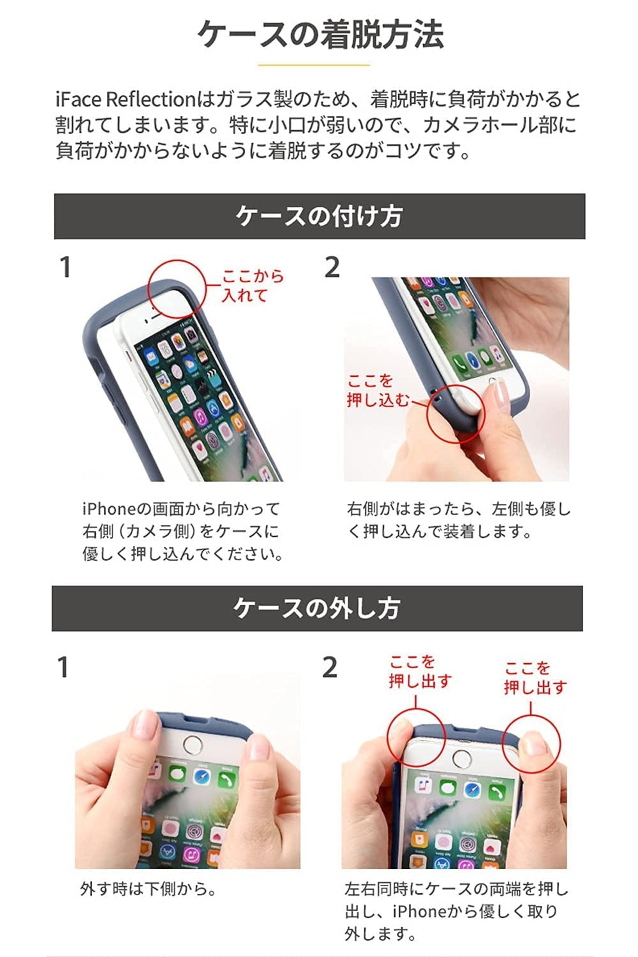 ●本製品ご使用における人体・スマートフォン本体を含む持ち物・データなどの損傷、損失、紛失に対し、は一切の責任を負いかねます。●スマートフォン本体やケースに発熱などの異常がある場合は本製品を外してください。
