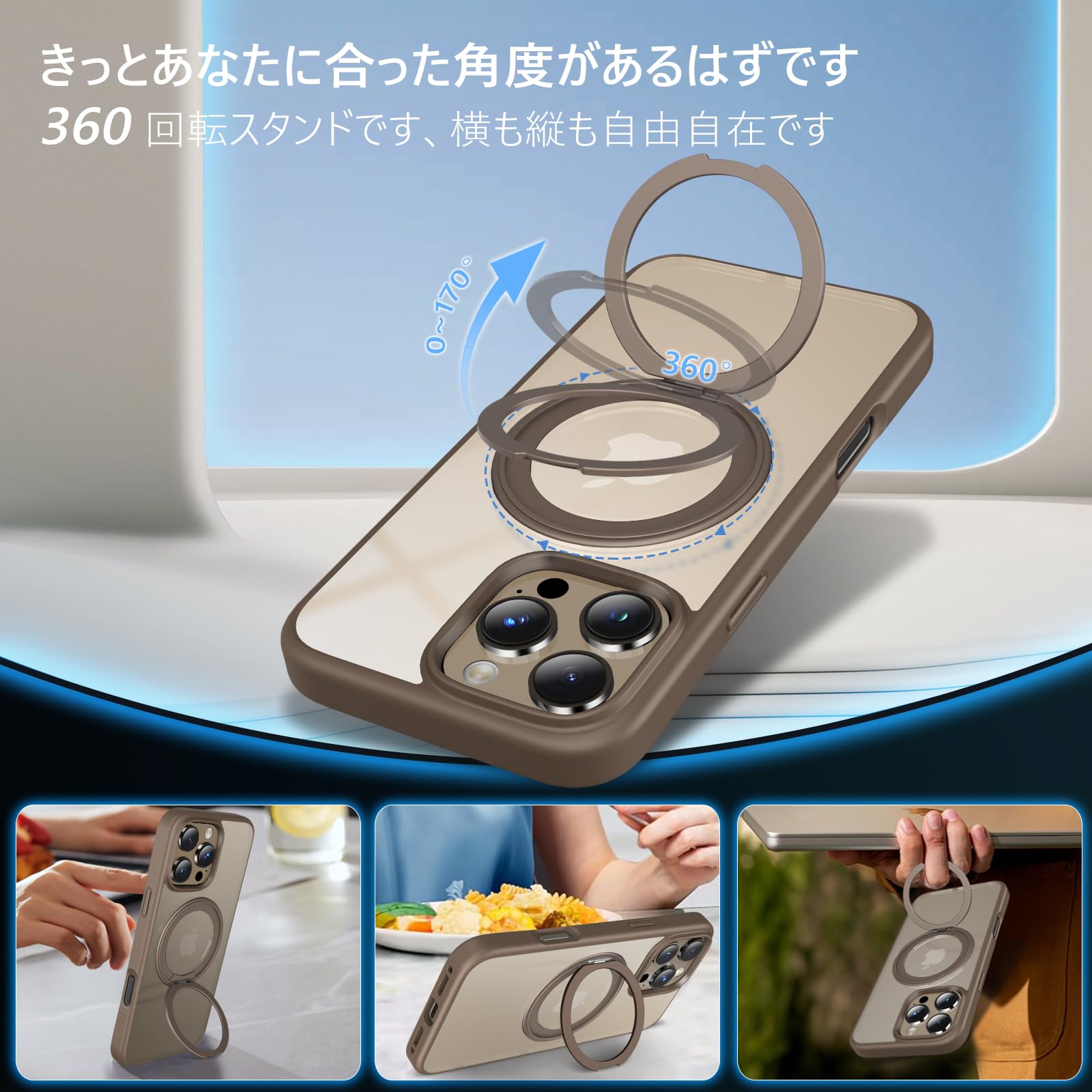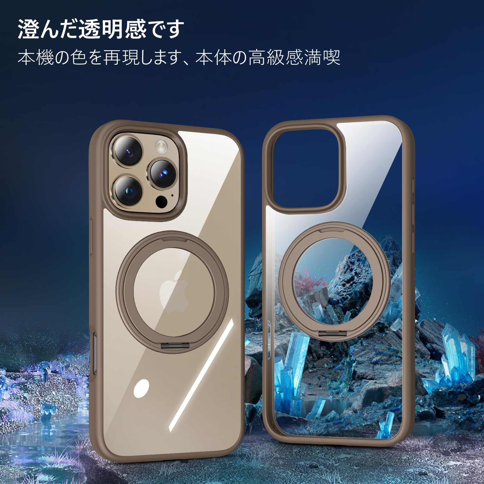 【360度回転スタンド・縦横両対応】KATSUTOYO いphone16promax 用 ケース 黄ばみにくい iphone16promax 用 ケース 強磁力リング マグネット搭載 360°回転スタンド 縦横両対応 MagSafe対応 高耐久性 米軍MIL規格 耐衝撃 指紋防止 アイホン16pro max 用 ケース(6.9インチ)背殻クリア ゴールド