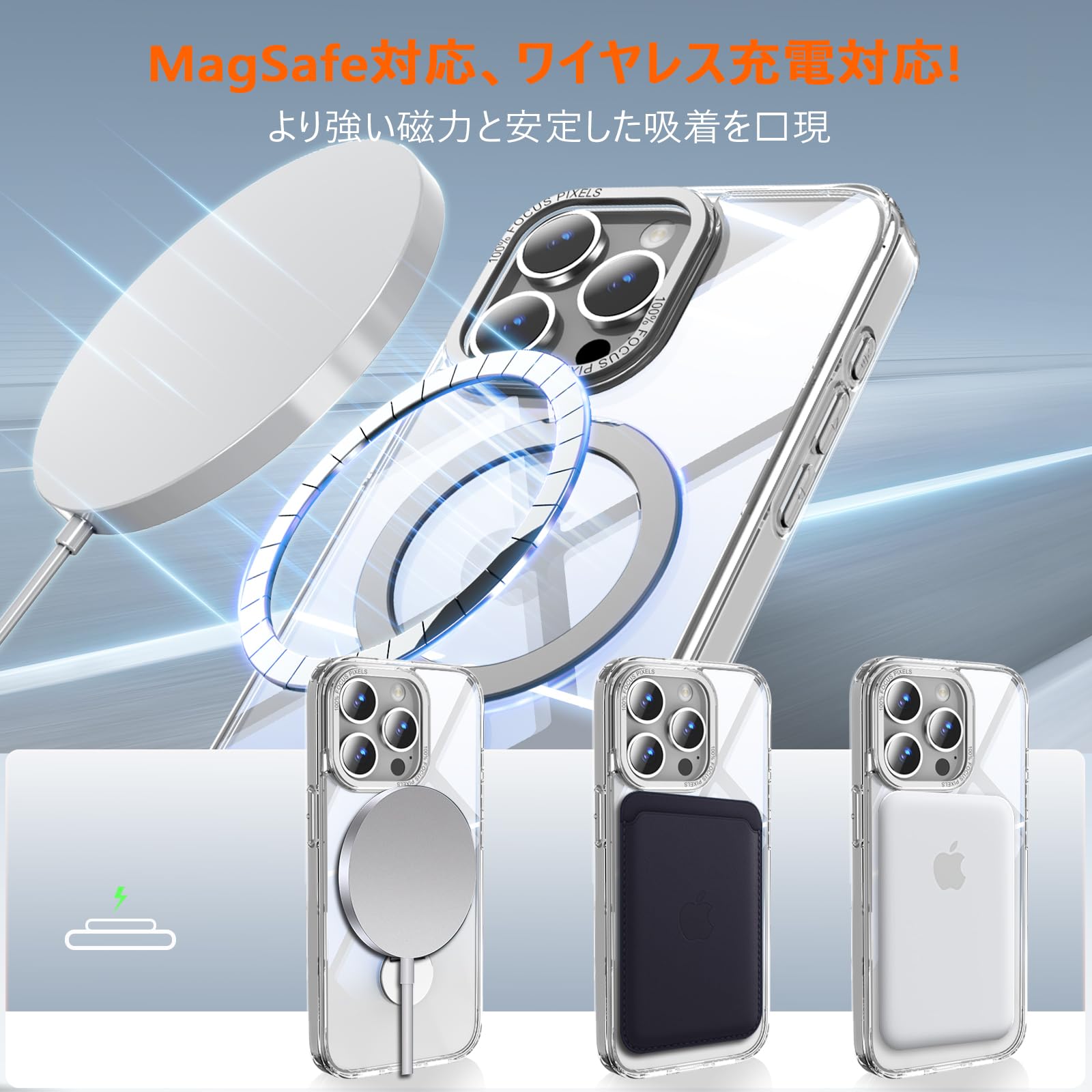 【MagSafe対応・強力な磁力吸着】アイホン15pro用ケースには、N52の高強度MagSafeテクノロジーが採用されており、MagSafe金具がしっかりと固定されて安定性を確保し、簡単に外れることはありません。携帯電話ケースには磁力がアップグレードされた強力なマグネットが搭載されています。ワイヤレス充電、モバイル電源、カーマウント、その他すべてのMagSafeアクセサリにも適しています。安定性を持ち、充電器を近づけると高速ワイヤレス充電が実現です。強力な吸着力で、ワイヤレス充電のためにスマートフォンケースを取り外す必要はありません。