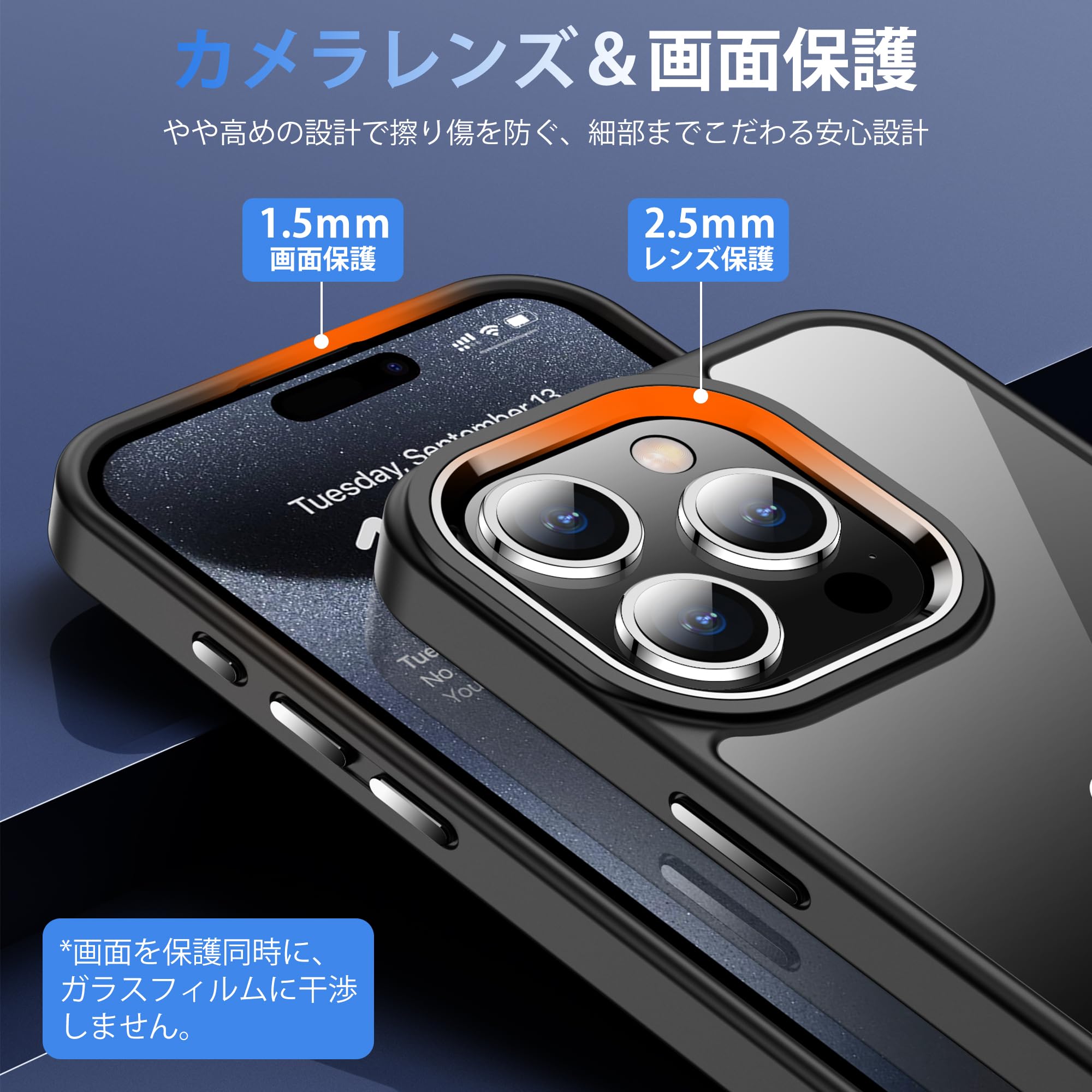 【液晶画面・カメラレンズ保護】アイフォン15Pro本体の曲線に従って高低差設計になります。フチをわずかに高く設計することで、外部と直接接触の傷つきを避けます。カメラレンズの周囲2.5mm高く、外部と直接接触の傷つきを避けます。カメラレンズをキズから保護できます。液晶画面より1.5mm高くなり、画面を保護同時に、ガラスフィルムに干渉しません。