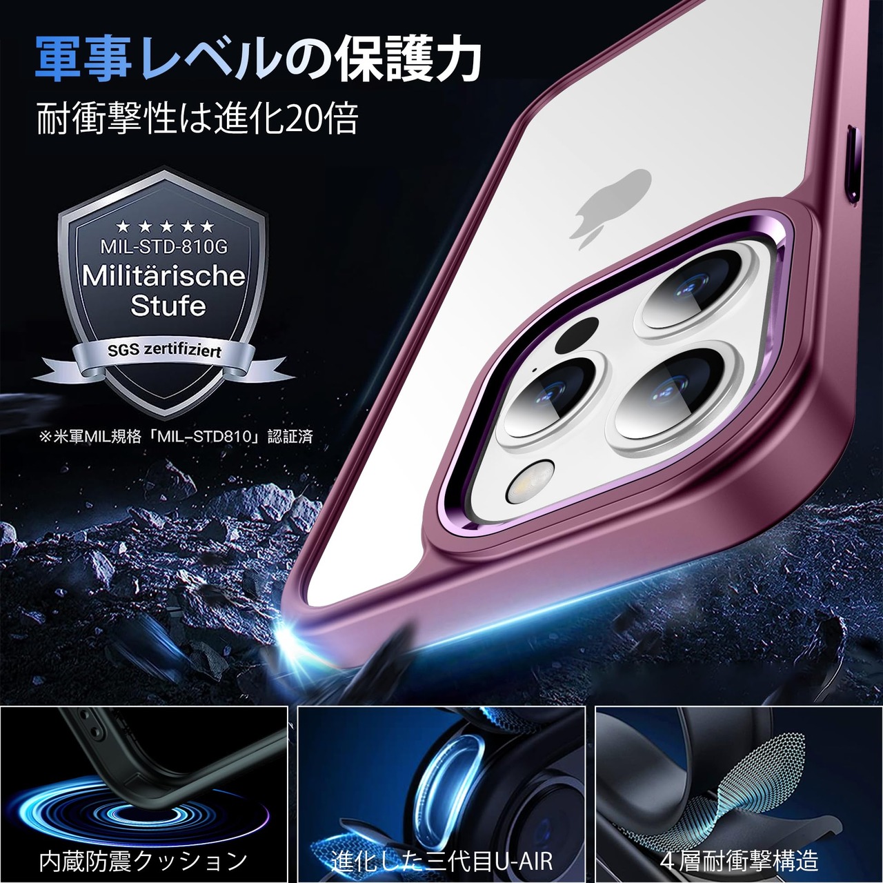 【絶妙バランス・快適操作】クリアケースの保護性能を保ちながら、スマートさを損なわないよう、薄さと強度のバランスを取り、手にフィットする程よい厚みで、快適さが保ち、ボタンも押しやすく、最適な設計で作り出す。背面高透明度のポリカーボネートと側面はSGS認証されたドイツ製のTPU素材の組み合わせで、装着・脱着も簡単になります。ワイヤレス充電やApple Payにも対応します。