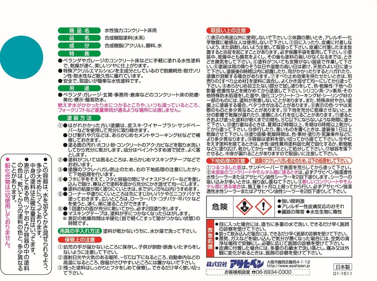 注意事項:※下塗りにはアサヒペン油性シーラーや強浸透性水性シーラーをお使いください。 ※フォークリフトなどの重量車両が通るような場所や、絶えず水がかかったり水につかるところやいつも湿っているところには不適です。 ※絶えず水がかかったり水につかるところや、いつも湿っているところには適しません。 ※クリヤはカラー塗装のトップコートです。単独でのご使用は避けてください。