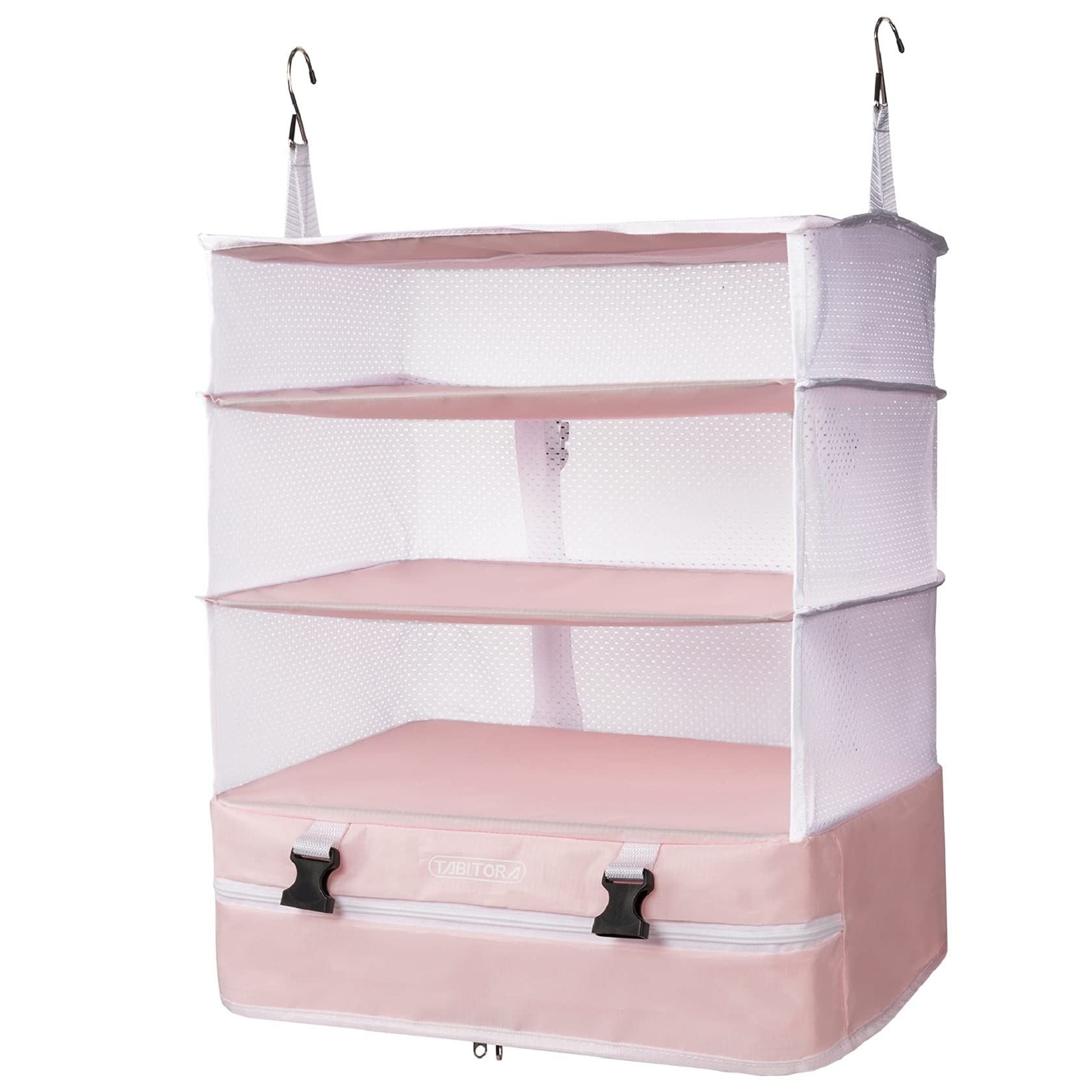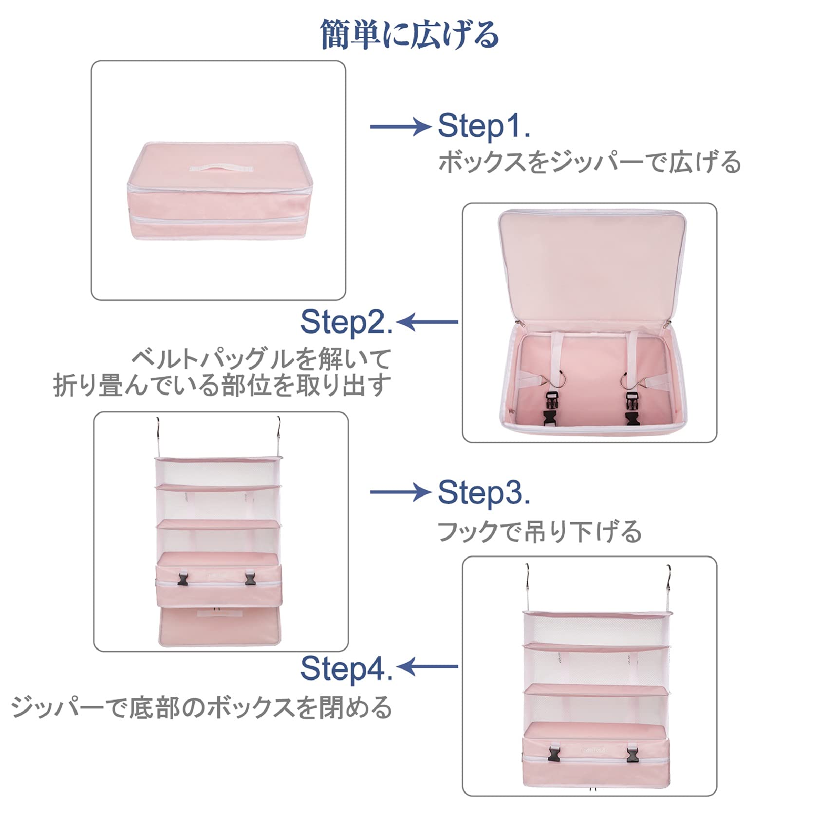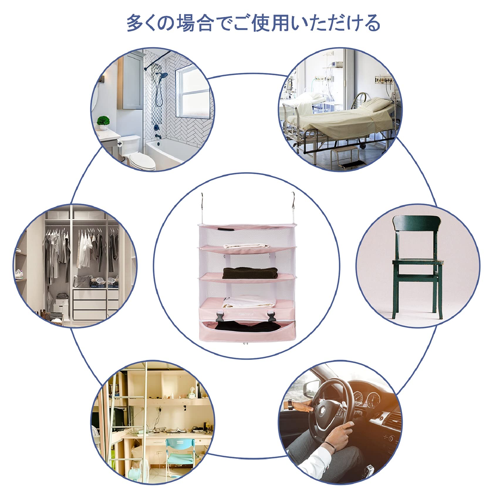 [タビトラ] クローゼット吊り下げ収納 インナーバッグ 衣類ラック 収納 旅行 出張 クローゼット 収納ボックス 吊り下げ 省スペース 大容量 衣装ケース 4段 取付簡単 折り畳み式 ピンクXL