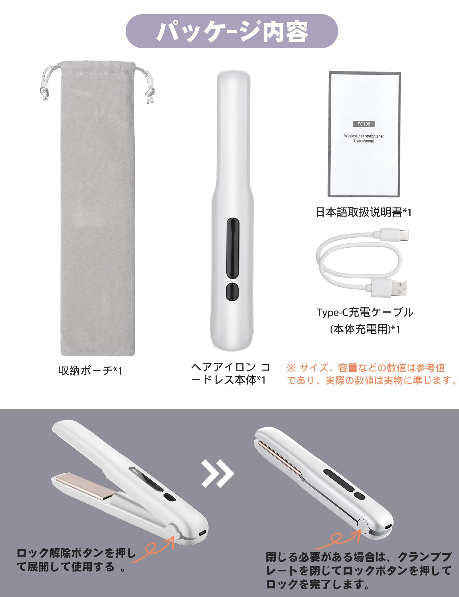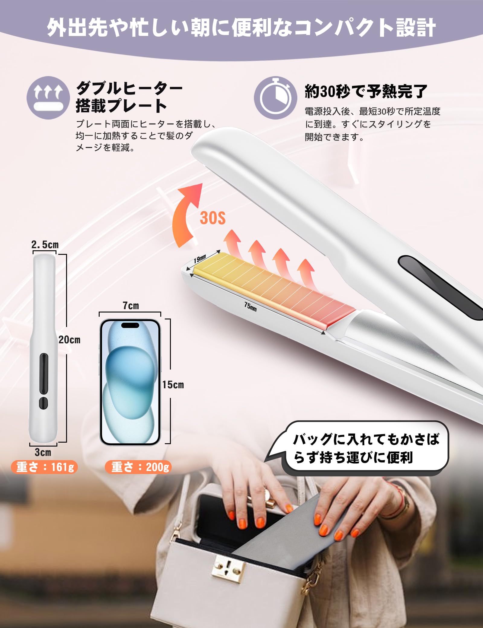 【コードレス&どこでも使える便利さ】コードレス設計、コンセントの位置の不便さを気にする必要がありません。 3200mAh大容量バッテリー内蔵。 40~60分間連続使用可能。場所を選ばずに使えるのが魅力。カフェでの作業前、旅行先のホテル、車の中など、いつでもどこでもサッと前髪や毛先のセットが可能。軽量・コンパクトでバッグにもすっきり収まり、持ち歩きも快適です。