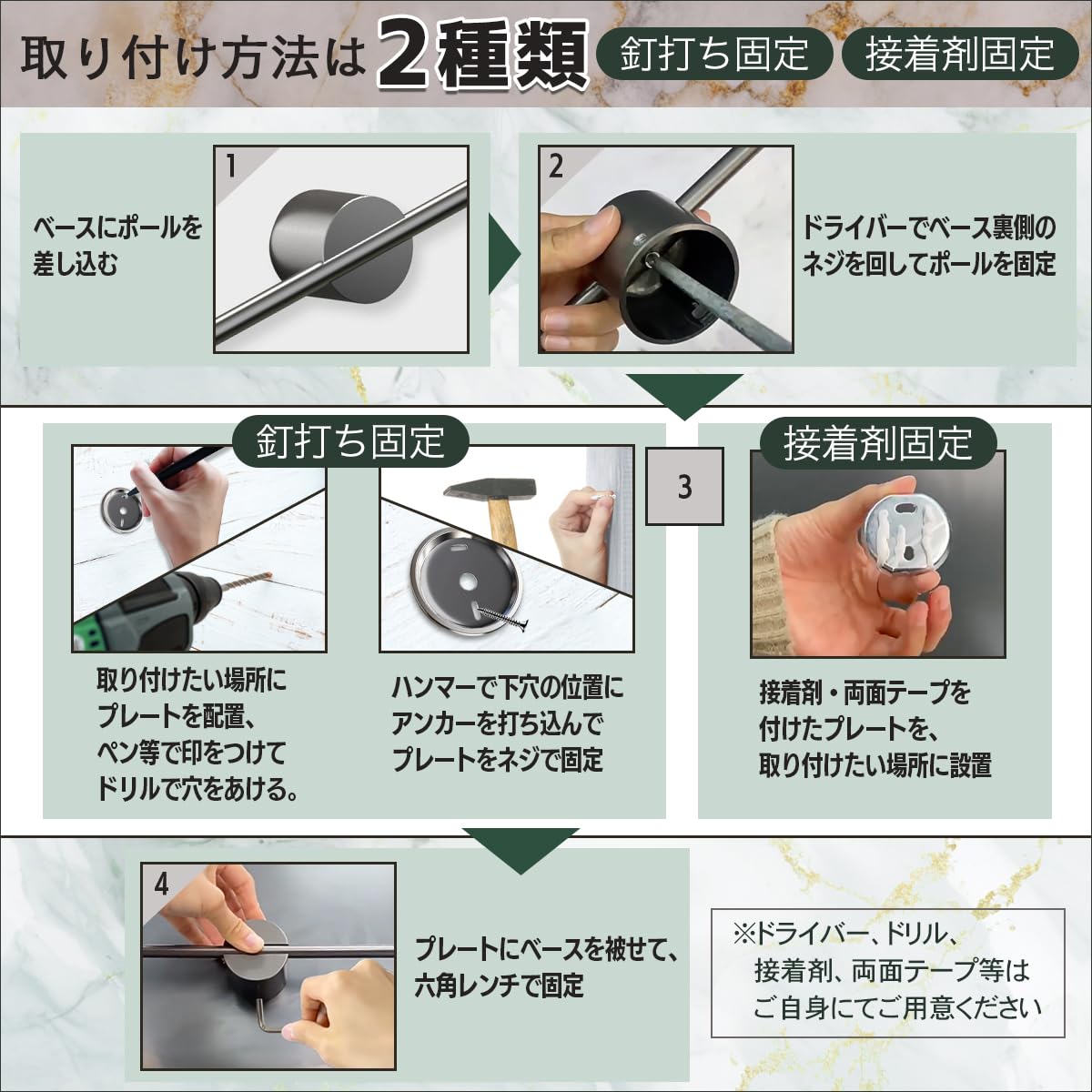 簡単設置で場所を選ばず活用できる多用途設計 取り付けは釘打ち固定や両面テープ、接着剤を使用した接着固定も可能です。穴あけの必要がないため、タイルや大理石、すりガラス、金属などの穴を開けられない場所への設置も簡単に取り付けが可能です。キャビネット、バスルーム、玄関、リビング、オフィスなど、多様な場所で使用でき、設置する壁を選びません。重いバスローブやキッチン用具も掛けられ、便利に活用できます。
