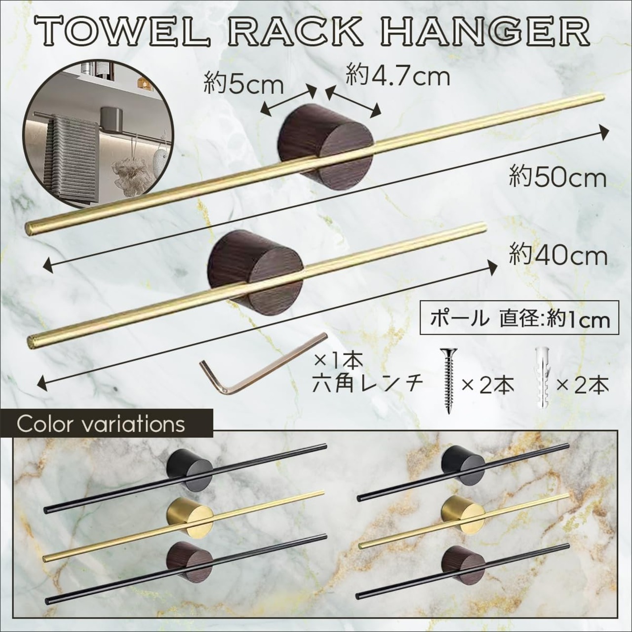 2サイズと4色のバリエーションでどんな空間にもフィット このタオルハンガーは、40cm、50cmの2サイズから選べ、オールブラック、ゴールド、ブラウンxゴールド、ブラウンxブラックの4色のバリエーション。シンプルでモダンなデザインは、どんなインテリアにも馴染み、キッチン、バスルーム、玄関など様々な場所に設置可能です。サイズやカラーを自由に選べるため、用途に応じてお部屋を美しくコーディネートできます。