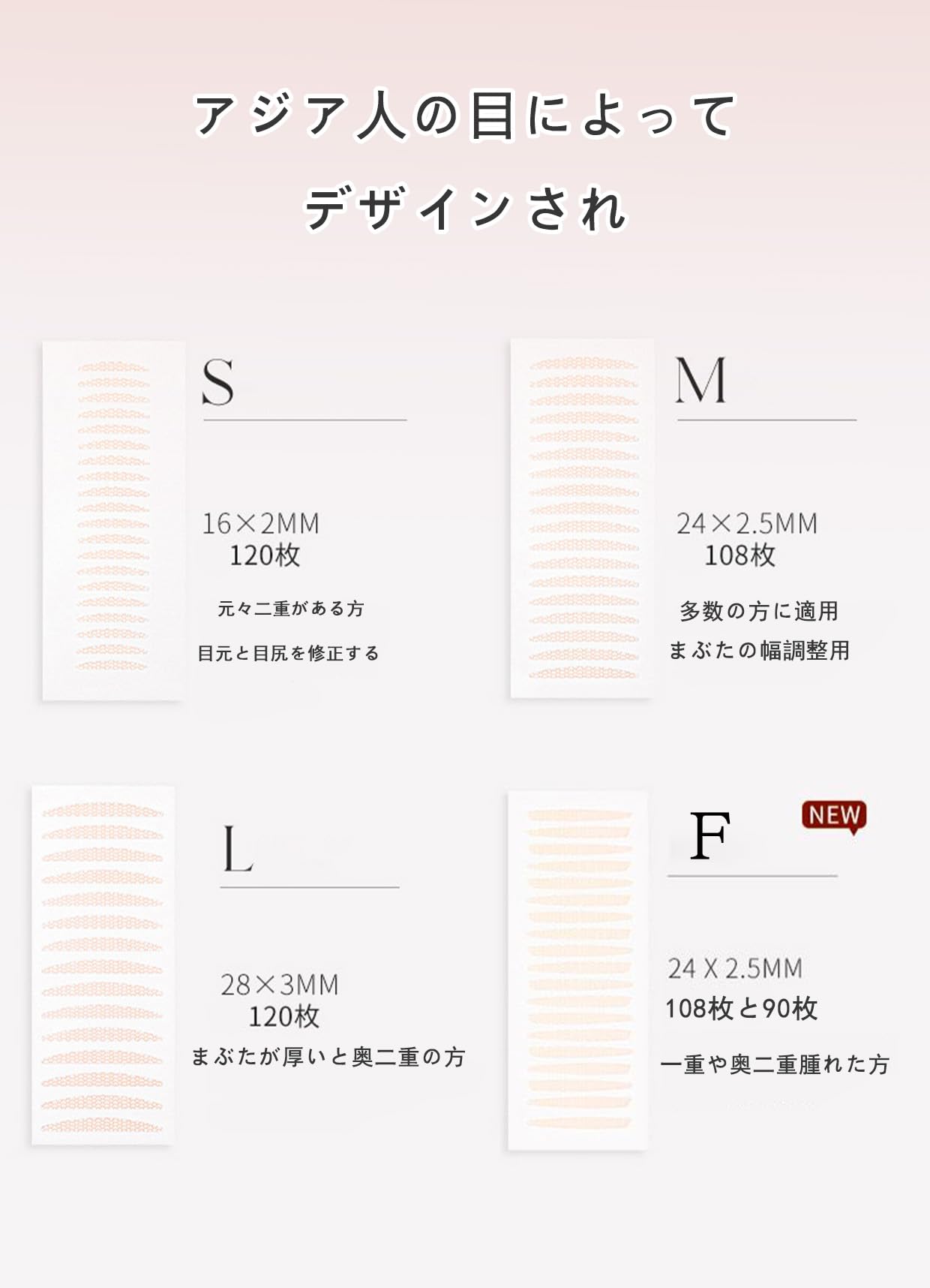 【アジア人の目によって設計】4種類のテープサイズ、既存二重、一重、奥二重、腫れたまぶたにも適用タイプ、S40枚/シート*3、?36枚/シート*3、?30枚/シート*4、F18枚/シート*6、F18枚/シート*5。