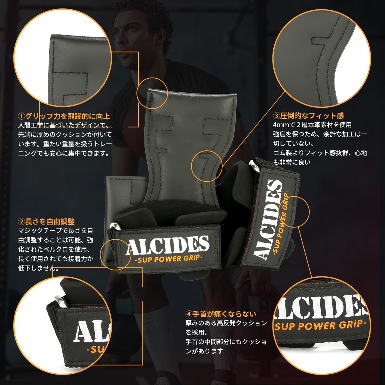 ◎【超強力なグリップ力/狙った筋肉をしっかりトレーニング】Alcides super パワーグリップは二層牛革(cowhide)を使用、従来品と比べて、滑りにくい、グリップ力が強いという特徴があります、握る為の力「握力」の消費を最小限に抑え、狙った筋肉に負荷をかけてしっかりトレーニング!「もう1回」「あと1回」が可能になります。