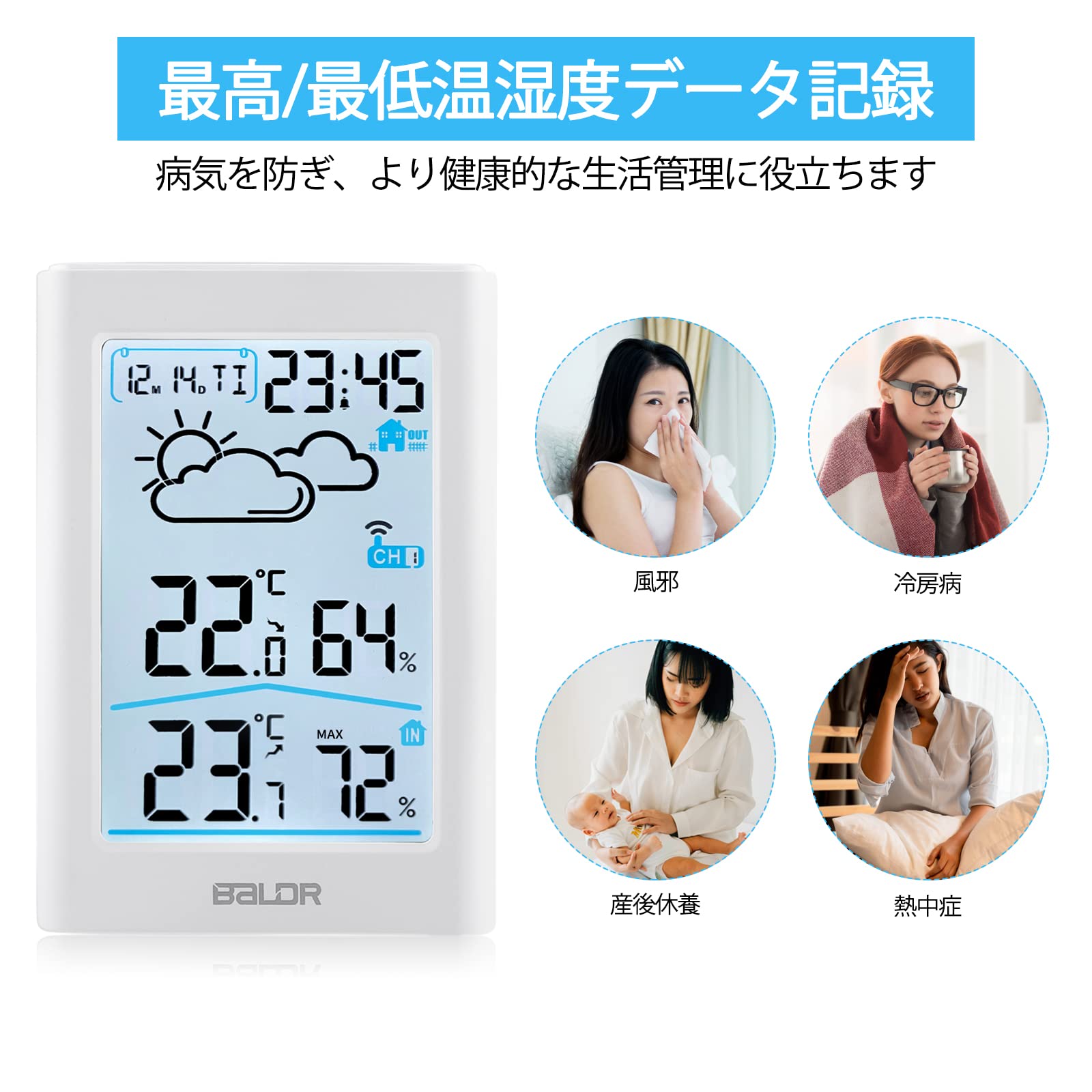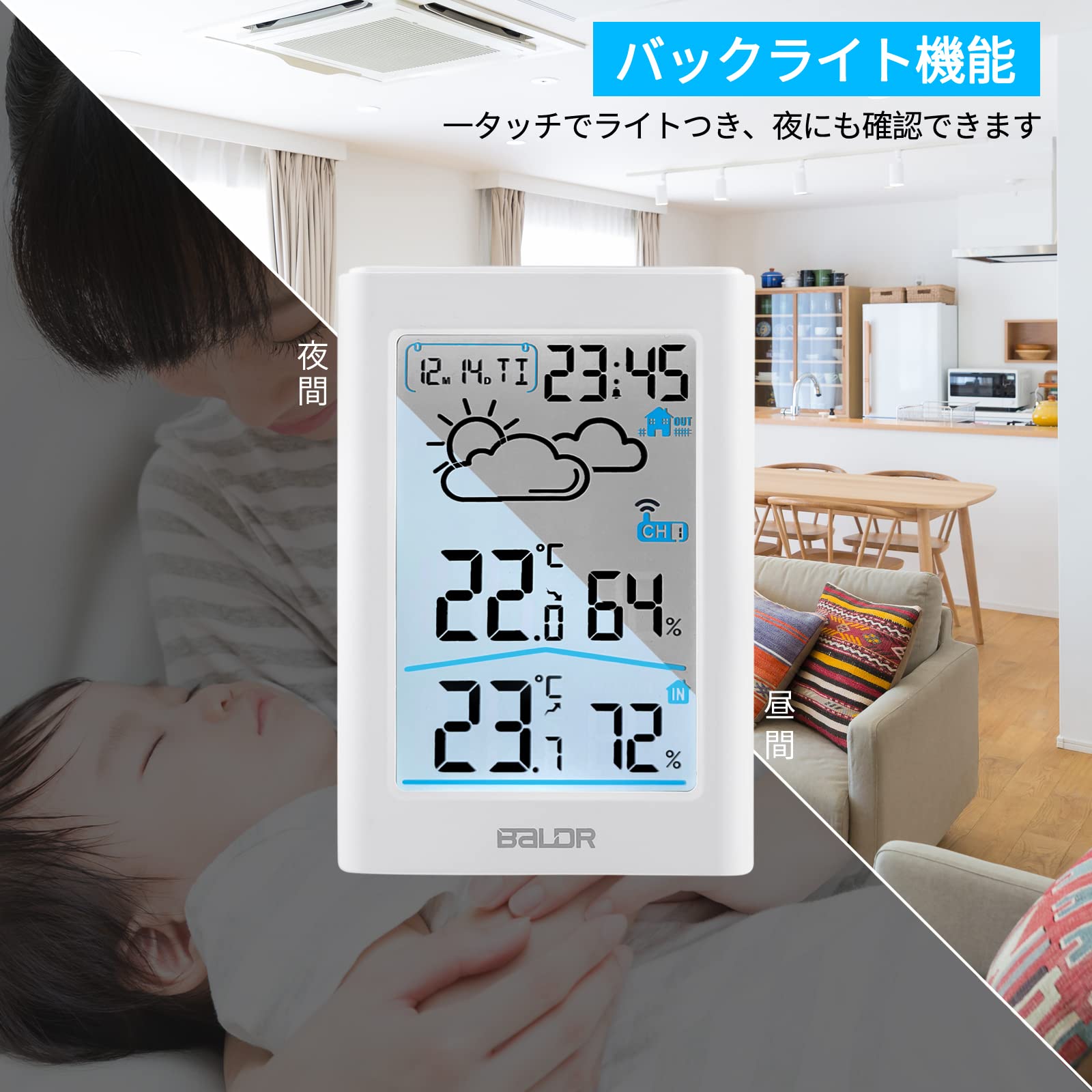 【独特なバックライト LCD大画面】小型ですが、見やすいLCD大画面を搭載しており、時計・日付・曜日・温度・湿度・天気予報は同時に表示でき、必要な情報は一目で確認できます。バックライトボタンを押すと、画面が明るくなります。夜中或いは暗いところでも確認しやすく、家族の健康管理、インフルエンザや風邪などの予防、お部屋の乾燥チェック、お肌の潤いを保つ、カビ対策や熱中症対策などに役立ちます。