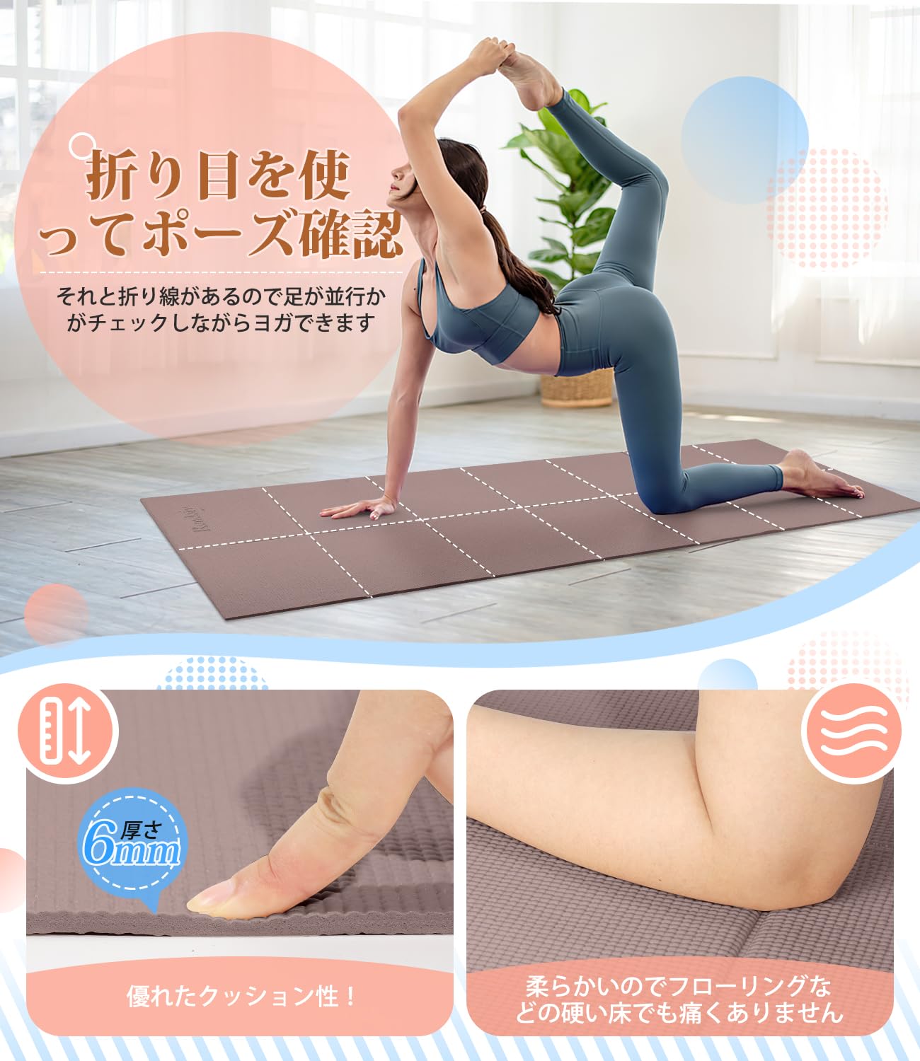【収納しやすい】この折りたたみ式ヨガマットは、素早くコンパクトに収納できるように設計されています。通常のヨガマットは丸めて袋に入れなければなりません。収納にスペースを取られますし、時間もかかります。折りたたみ式ならシンプルな折りたたみのみで最もシンプルなデザインを実現させます。折りたたむと非常にコンパクトになるので、部屋のどこにもサッと置けるのでディリーユースにぴったりです。また、ヨガマットに折り目をつけると、ヨガやエクササイズの際にポーズや体が平行になっているかどうかを簡単に確認できますので、コアトレーニングにぴったりです!