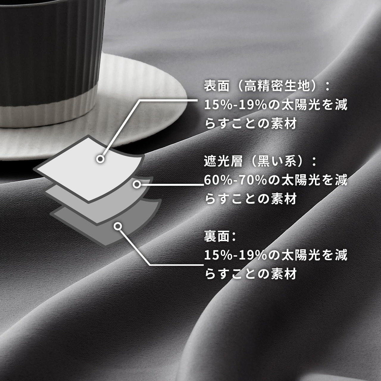 ◆【一級遮光】このカーテンは遮光度が99.99%以上,外からの光をほとんど通さないため、昼間カーテンを閉めたお部屋のなかで相手の顔の表情が分からない程度にまでお部屋を暗くできます。同じ等級であっても、カーテンの明度や色彩によって遮光の度合いが変わります。薄い淡い色は光を通しやすく、濃い暗い色は光を通しにくいです。遮光性を重視される方は濃色をおすすめします。