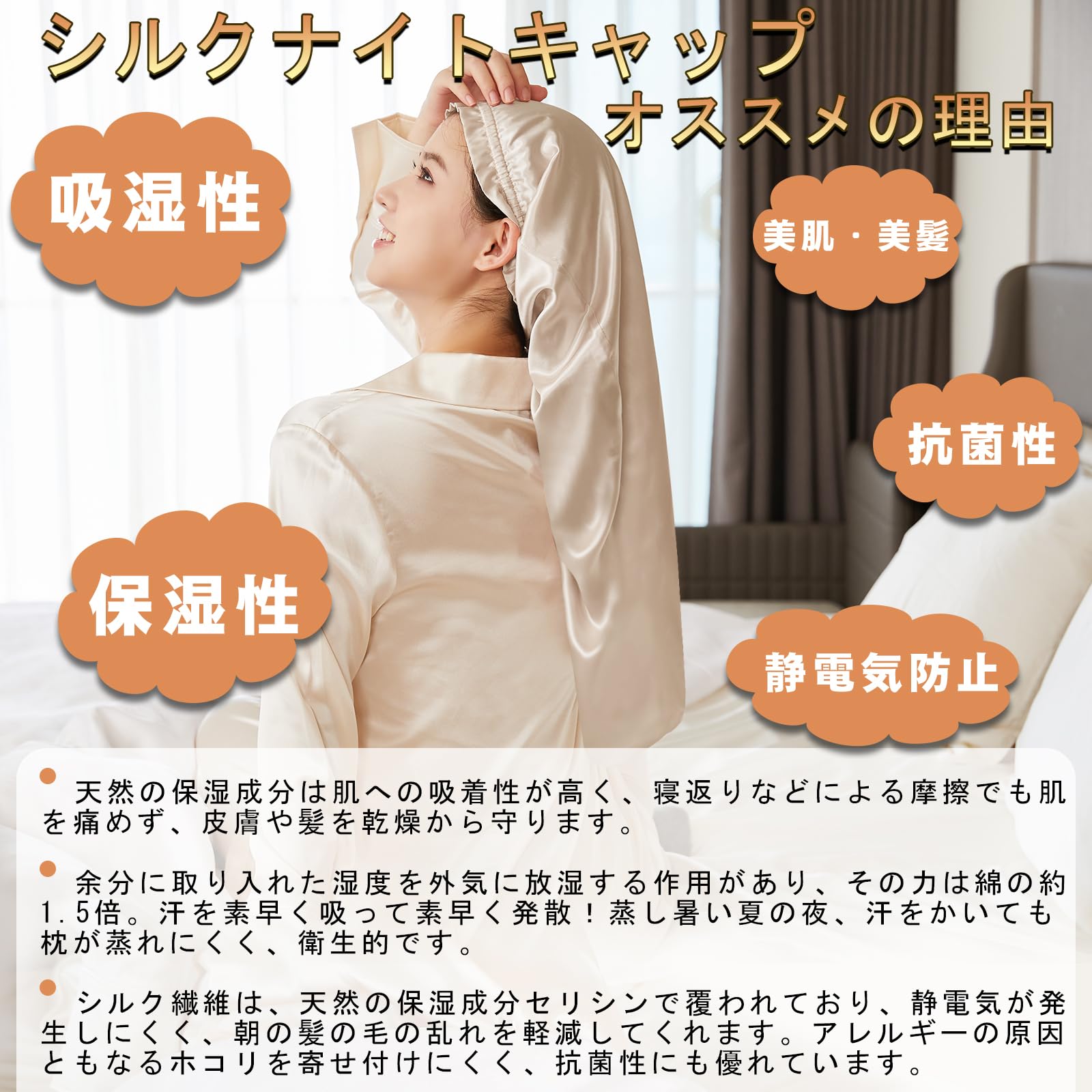 シルクは古代から愛用され、人間の肌と同じタンパク質でできているシルクの素材は真珠のような光沢、吸湿性と放湿性に優れている、紫外線を吸収できるというメリットがあります。 シルク製のナイトキャップ は、保湿性能も高く、頭皮や髪の乾燥を防いでつややかな美髪をサポート。