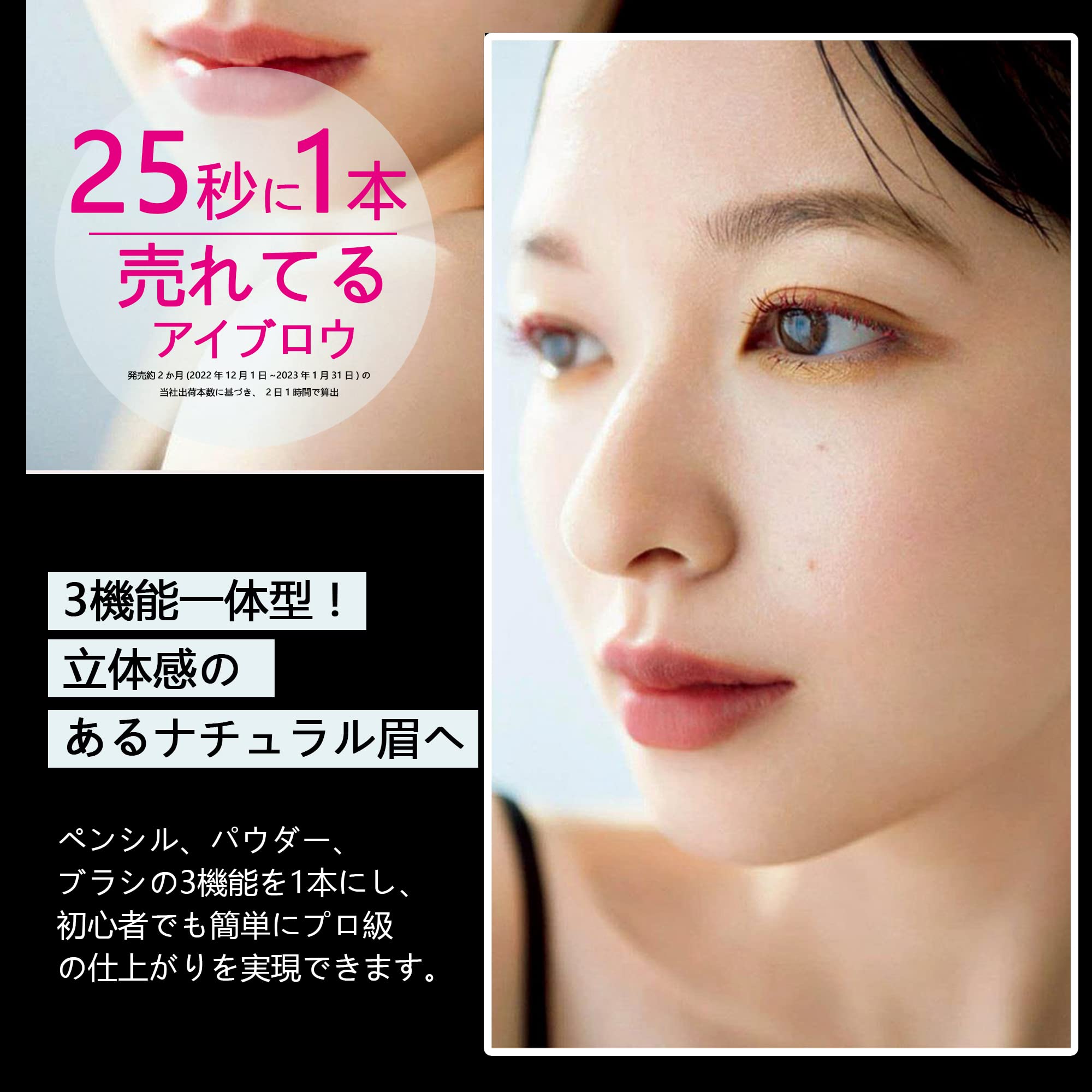 「1本3役、ぼかし&ライン自由自在」削らず便利な繰り出し式アイブロウペンシル、最細1mm/最太3mmの三角芯が眉にフィット、面を使って、眉頭や眉全体に自然な立体感を、角を使って、眉尻もラクラク描き足せる。これ1本で簡単立体眉へ。