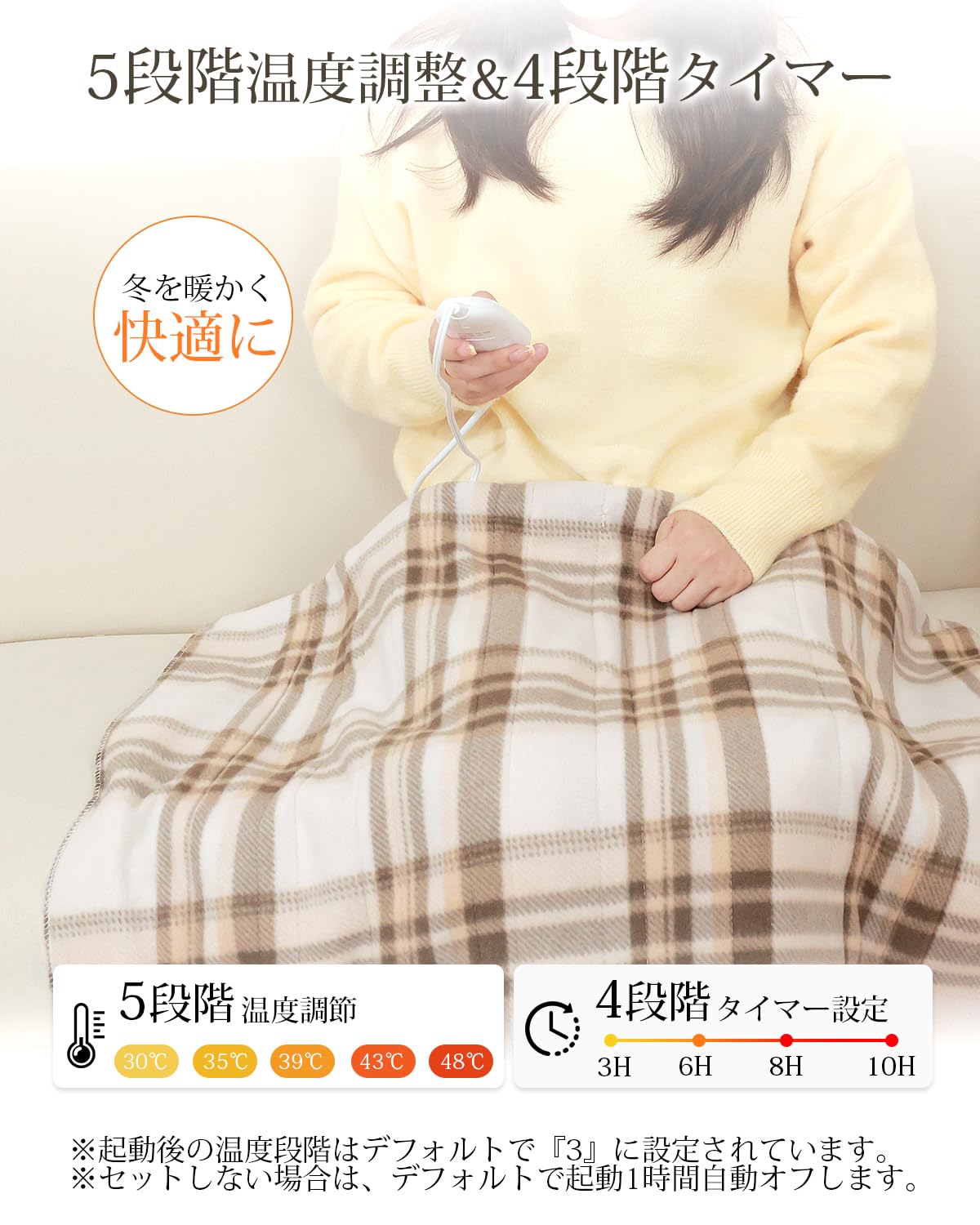 【切り忘れ防止タイマー付き・5段階温度調整】電気敷き毛布はボタンを押すだけの簡単操作で、温度とタイマーの時間を細かく設定することができる。コントローラーを備え、ボタンを押すだけで温度を(30、35、39、43、48℃)5段階の範囲で調節できます。また、この電気毛布敷きはタイマー機能が搭載され、3、6、8、10時間をご自由に選択できます。外出の時、電源を消したかの不安は必要ない。