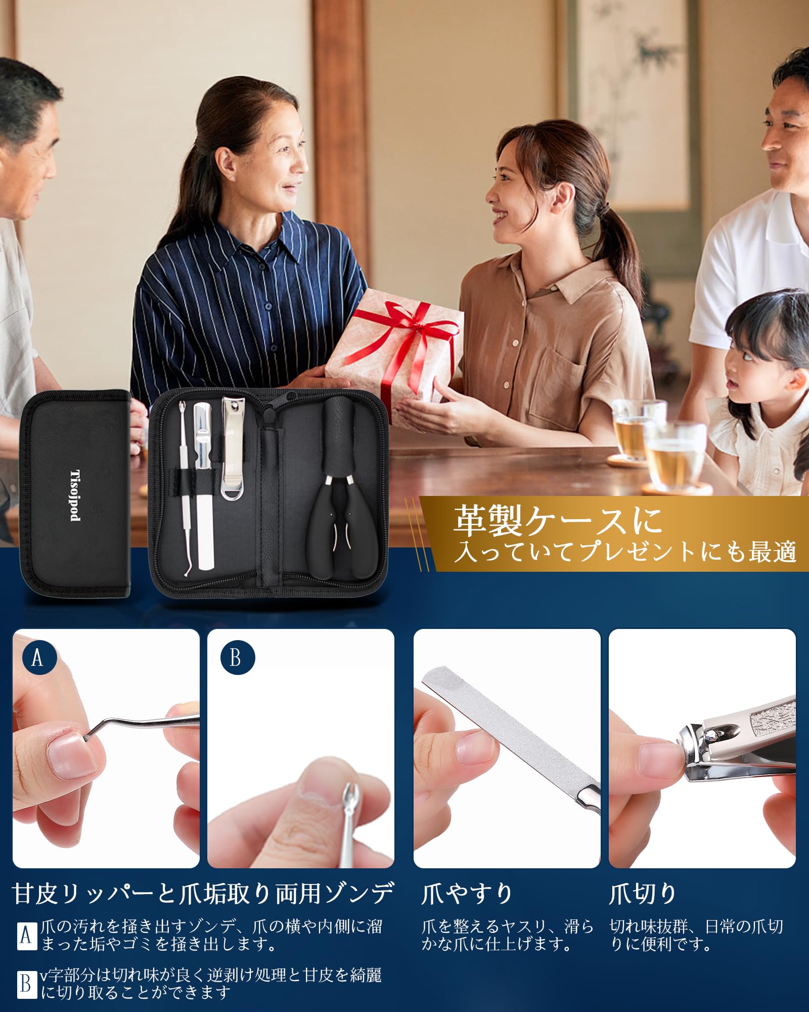 Tisojpod 爪切り ニッパー 巻き爪 厚い爪 陥入爪 硬い爪に適用 切れ味 高級 爪やすり 甘皮リッパーと爪垢取り ゾンデ付き セット 手足両用 高齢者 人気 ギフト 革製ケース付 男女兼用 (黒)
