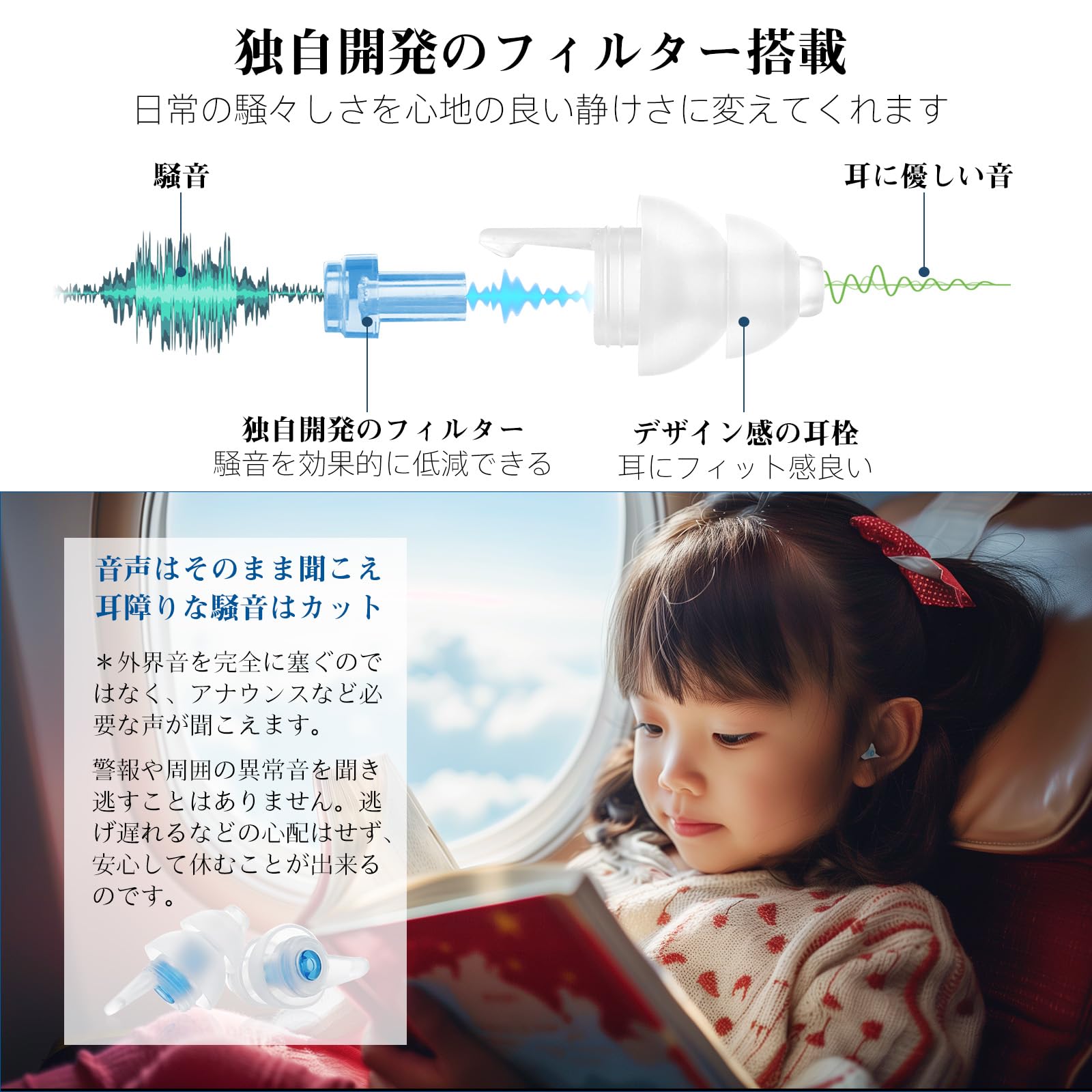 【多種場合適用&セット内容】★この子供用耳栓は飛行機用だけでなく、読書や勉強、集中力アップにも活用できます。ライブ、映画館や花火会場、スポーツイベント、コンサート会場でも聴覚を保護できます。自宅、電車、旅行、長距離移動中などのうるさい環境での不快感がある時にもご利用いただけます。★セット内容:①子供用耳栓2ペア、②フィルター2ペア(*出荷時、フィルターは耳栓に装着済。)、②紐1本、④アルミケース1個、⑤透明ケース1個、⑥日本語取扱説明書1枚。
