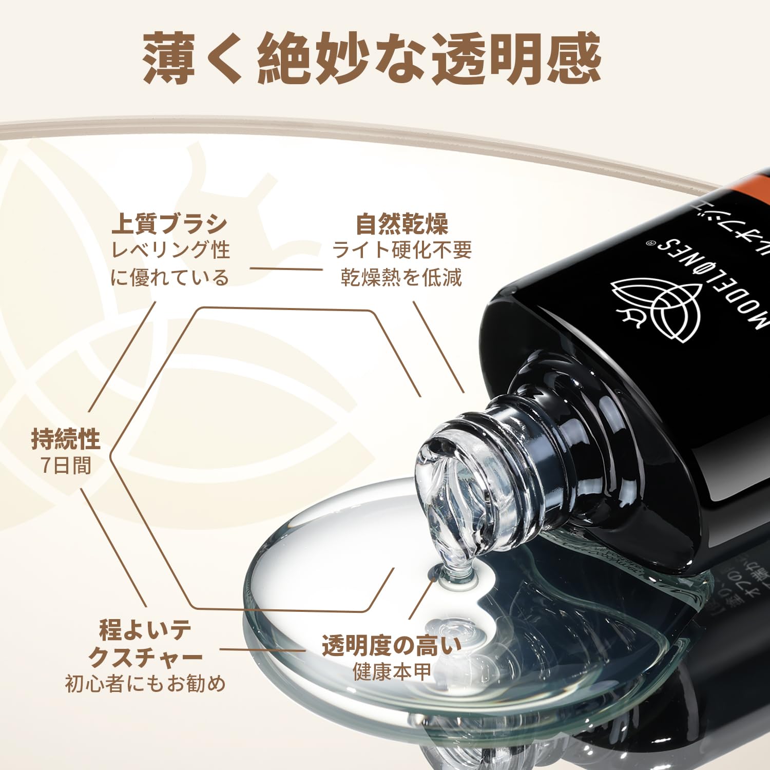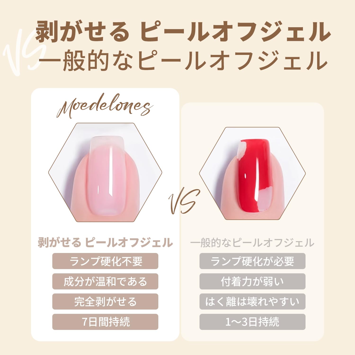 7天以上持続:Modelonesピールオフベースは、適切な施術の下で通常7日-9日持続します。ピールベースは専用の原料を使用しているため、あとも残らずきれいに剥がすことができます。さらに爪が乾燥せず傷まない・オフ後のべたつきも残りません。爪が傷むことが心配な方にも安心してお使いいただくことが可能です