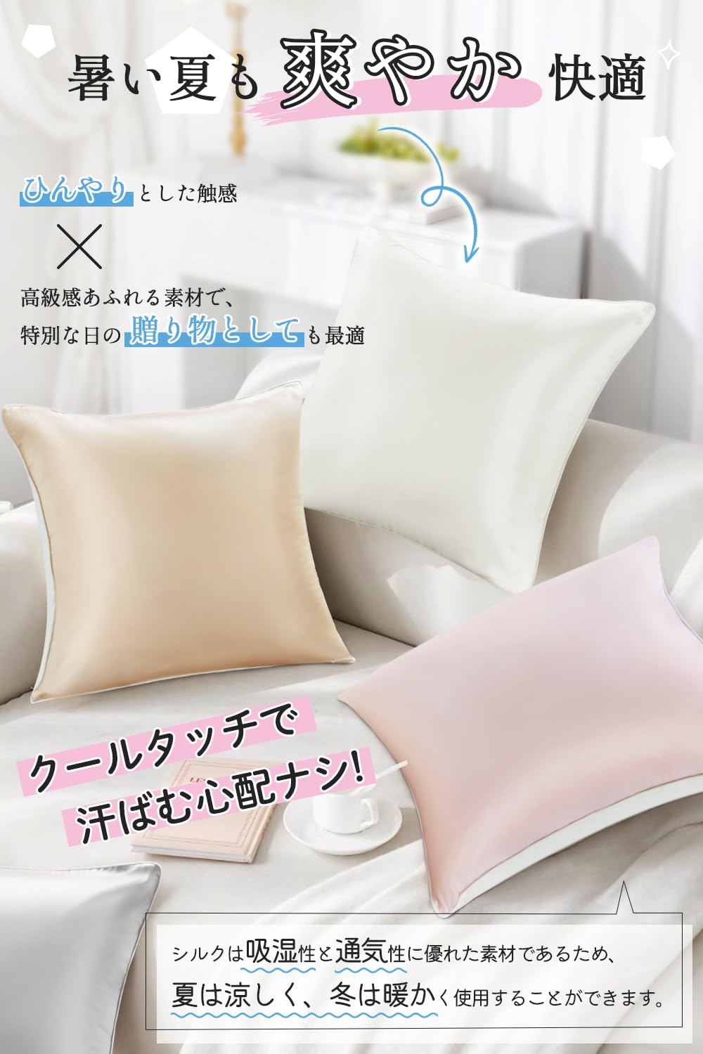 ??【服の毛玉を防ぐ&天然抗菌&オールシーズン使える】 シルククッションカバーは両面とも滑らかな素材で作られており、使用時にクッションや座布団としても衣服との摩擦を効果的に減らします。これにより、衣服の毛玉ができるのを防ぎます。シルクには保湿作用があるだけでなく、吸湿性・放湿性・通気性にも優れています。そのため、使用時に汗をかいても枕が蒸れにくく、抗菌性が高いので、安心してお使いいただけます。また、シルクは通気性が良く、保温性もあるため、夏は涼しく冬は暖かく過ごせます。これにより、一年中快適に使用できます。